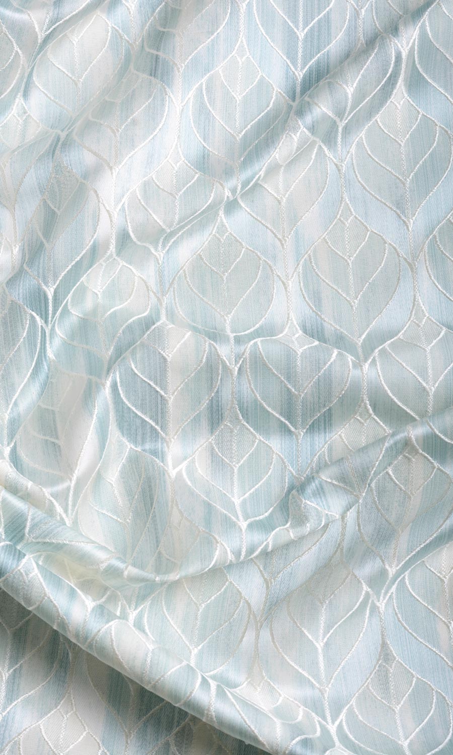 Muted blues and leaf ribs all over - a still from a nostalgic cloudy evening sidewalk! This understated beauty that taps the coolness of aqua blue and grey in foggy shapes offers a contrast of forms with the neatly outlined leaf motif layered on top. With a vast capacity to mingle with varied decor styles, curtains and roman shades in this lovely fabric are a timeless addition to the home.