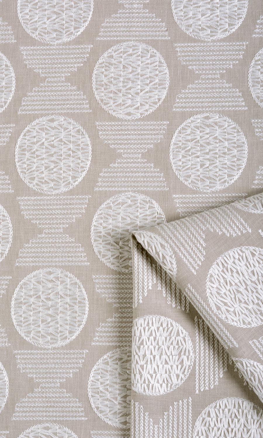Geometry transforms into refined harmony. This beautiful beige fabric has been embroidered in white thread with circles and half circles motifs placed alternately. The look is understated yet elegant. A good choice for those who like the neutral look with a touch of decorativeness in their decor.