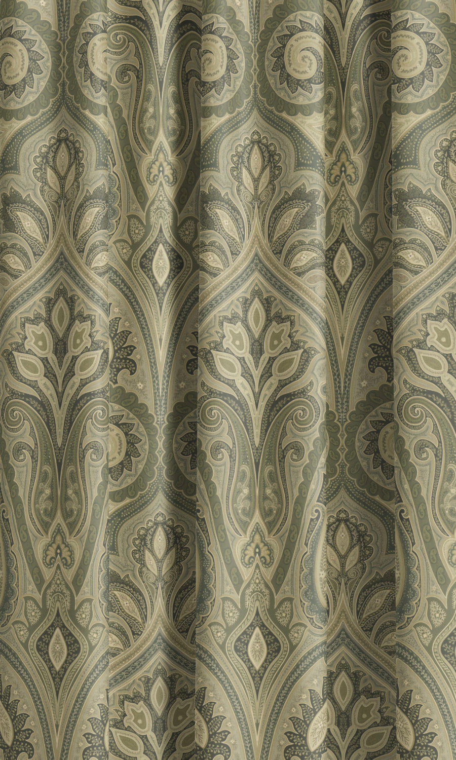• Its regal fusion of damask and paisley where scrolling arabesques and teardrop whorls entwine in heritage elegance