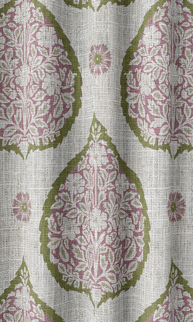 Welcome home a marvel from traditional Indian art with this classic fabric featuring ancient Mughal motifs in a modern palette of pink and green. Large cordate leaves interspersed with tiny scattered blooms offer an intriguing contrast of proportions while the narcissus shrub enclosed within the leaf delivers intricacy with sophistication. Window treatments in this paisley-inspired fabric are self-assured statement pieces.