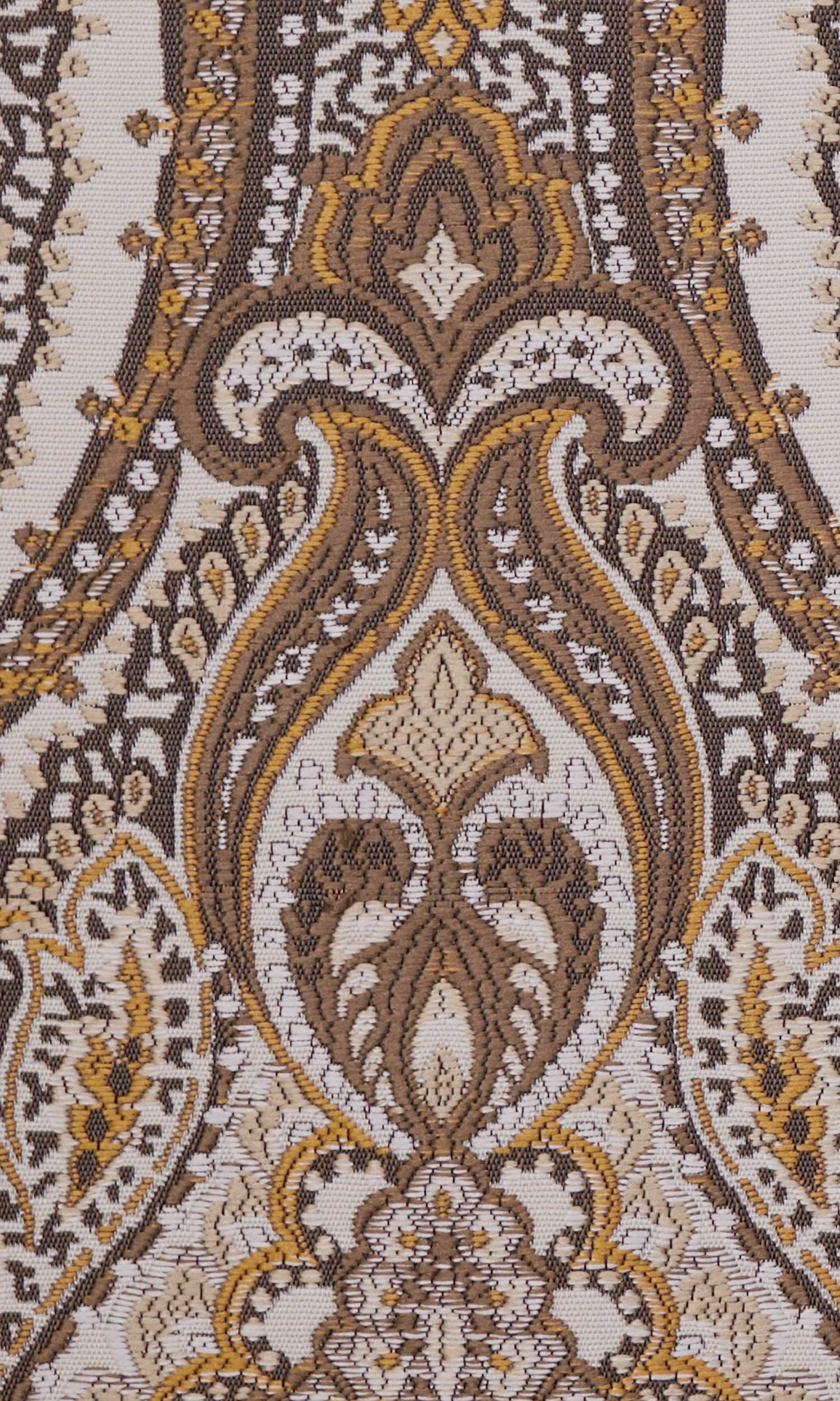 This plush jacquard woven fabric features a stunning motif reminiscent of antique Persian rugs prized by the connoisseurs. The intricate weave in glowing shades of caramel brown, ocher yellow, burnt umber and soft white looks bewitchingly beautiful. Utterly patrician!