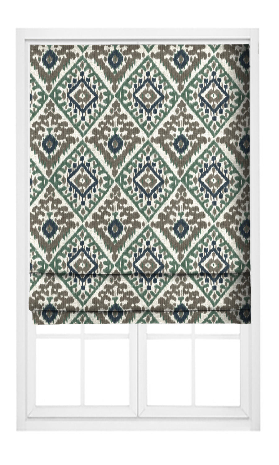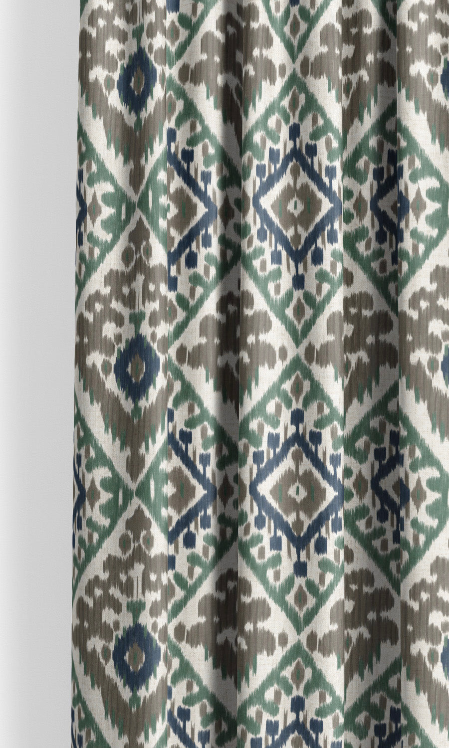• Its balanced palette, where navy blue and forest green bring cool depth and taupe brown lends earthy warmth