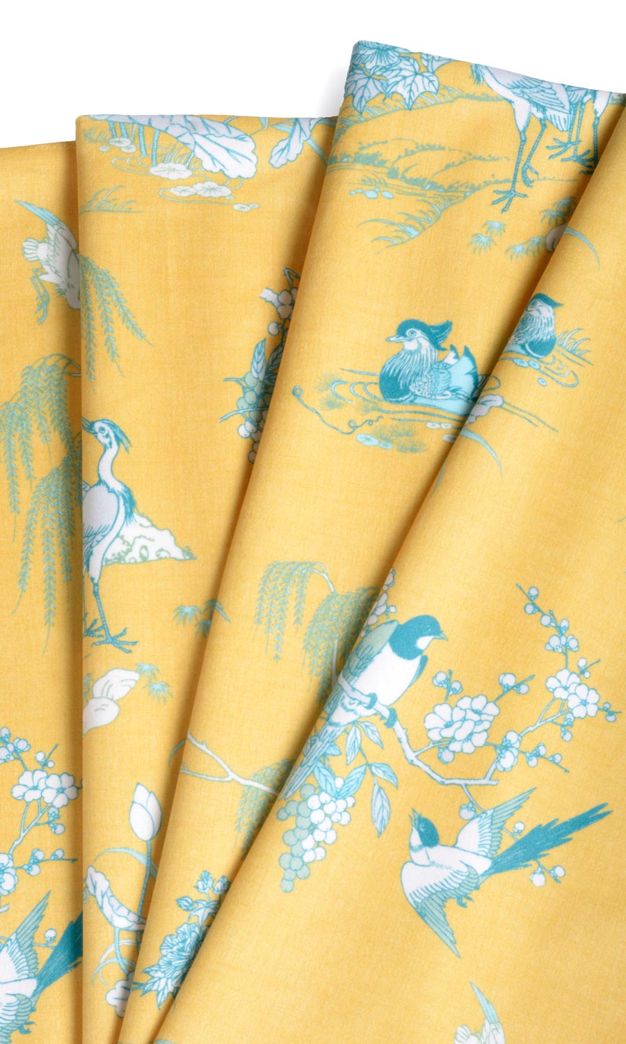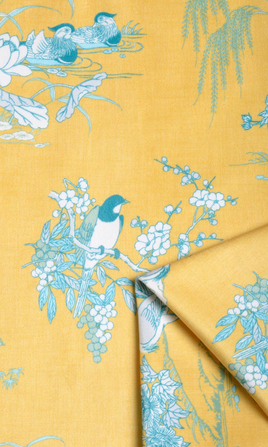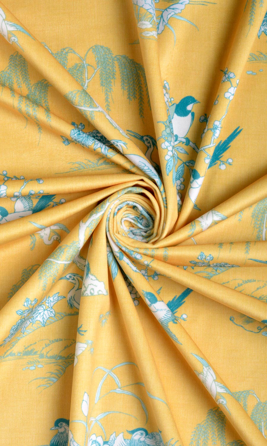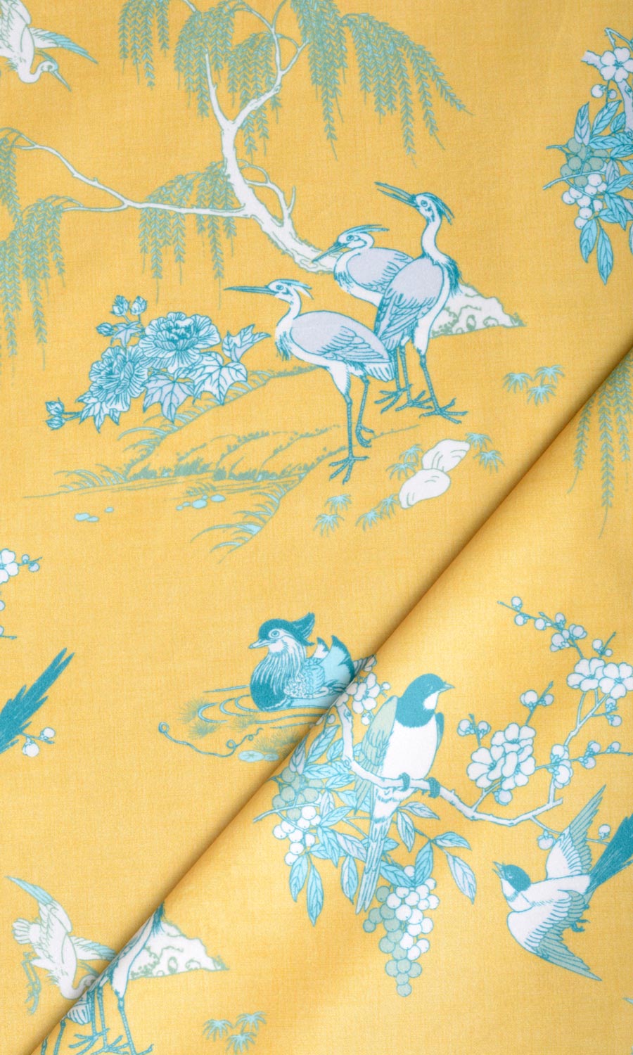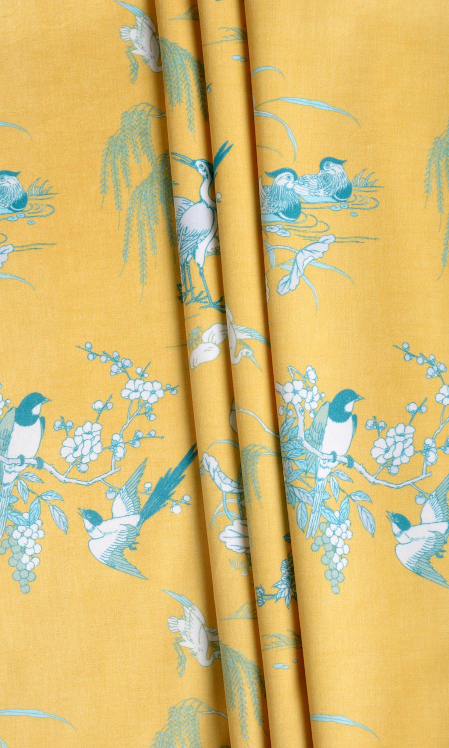 A wholesome treat for lovers of chinoiserie and toile lovers, this marigold yellow velvet features an illustrative depiction of the hurly-burly life of birds in blue and white sketches. Cranes, swans and larks commune with same-feather folks in glittering ponds and fruit-laden boughs. Nature themes and modern palettes collude beautifully in this velvet print. If you’d love to cover your walls with nature-scene wallpapers but cannot, window treatments in this sightly fabric offer a smart alternative.