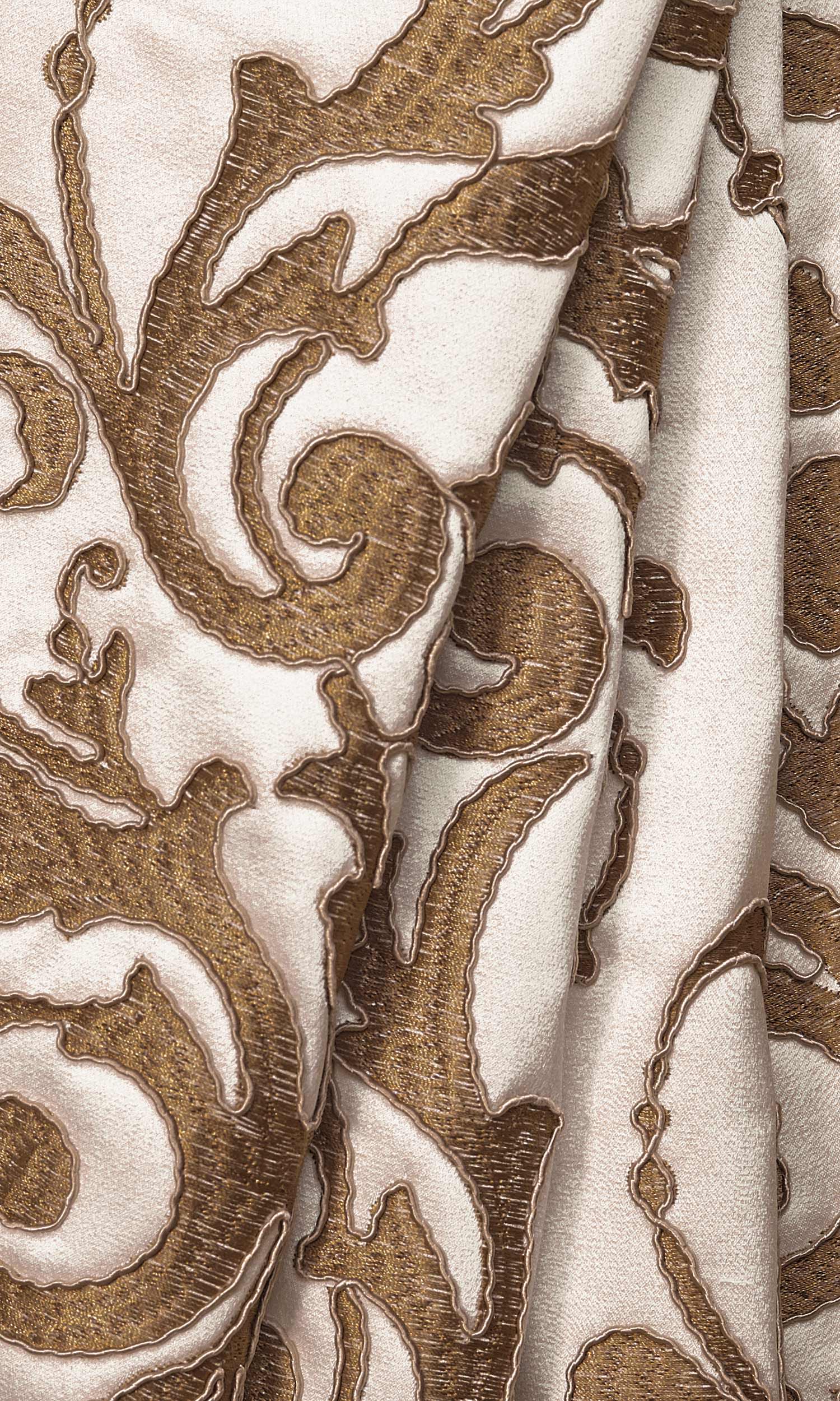 When your room needs a finishing touch of real class, drape it with this exquisite embroidered fabric with running columns of a classic tendril motif. The color scheme of soft white and warm brown is utterly gorgeous. The embroidery's beauty gets extra definition with raised edging effect.