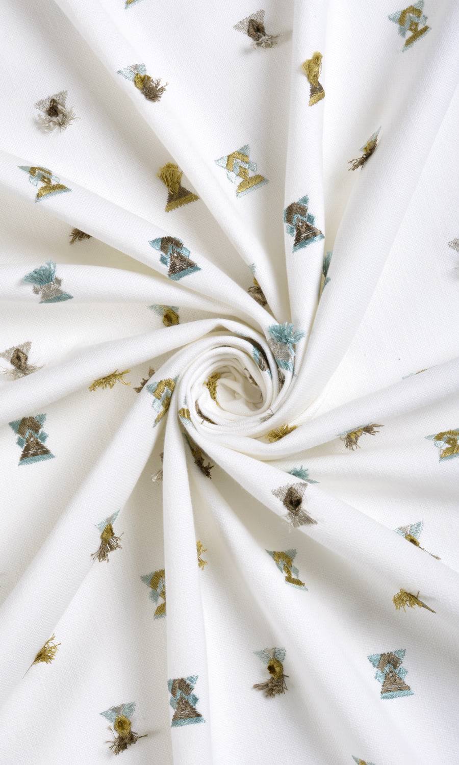 Baby Bloom is part poetry, part panache and pure luxury. Its white base fabric has been embroidered with multicolored geometric motifs in pastel shades of pale green and sky blue. Some of these have a slight tasseled look for a designer feel. Alternate and not-too-crowded placement of motifs creates a feel of visual harmony.