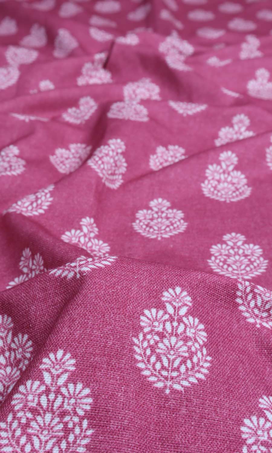Floral bliss with elegant craftsmanship. A beautiful block-printed Indian floral piece with intricate details and deep colors. Add this exotic piece to your potpourri of special finds and antique treasures to elevate its eclectic character further. And, brighten up any room with the popping vibrancy of the magenta pink & white palette.