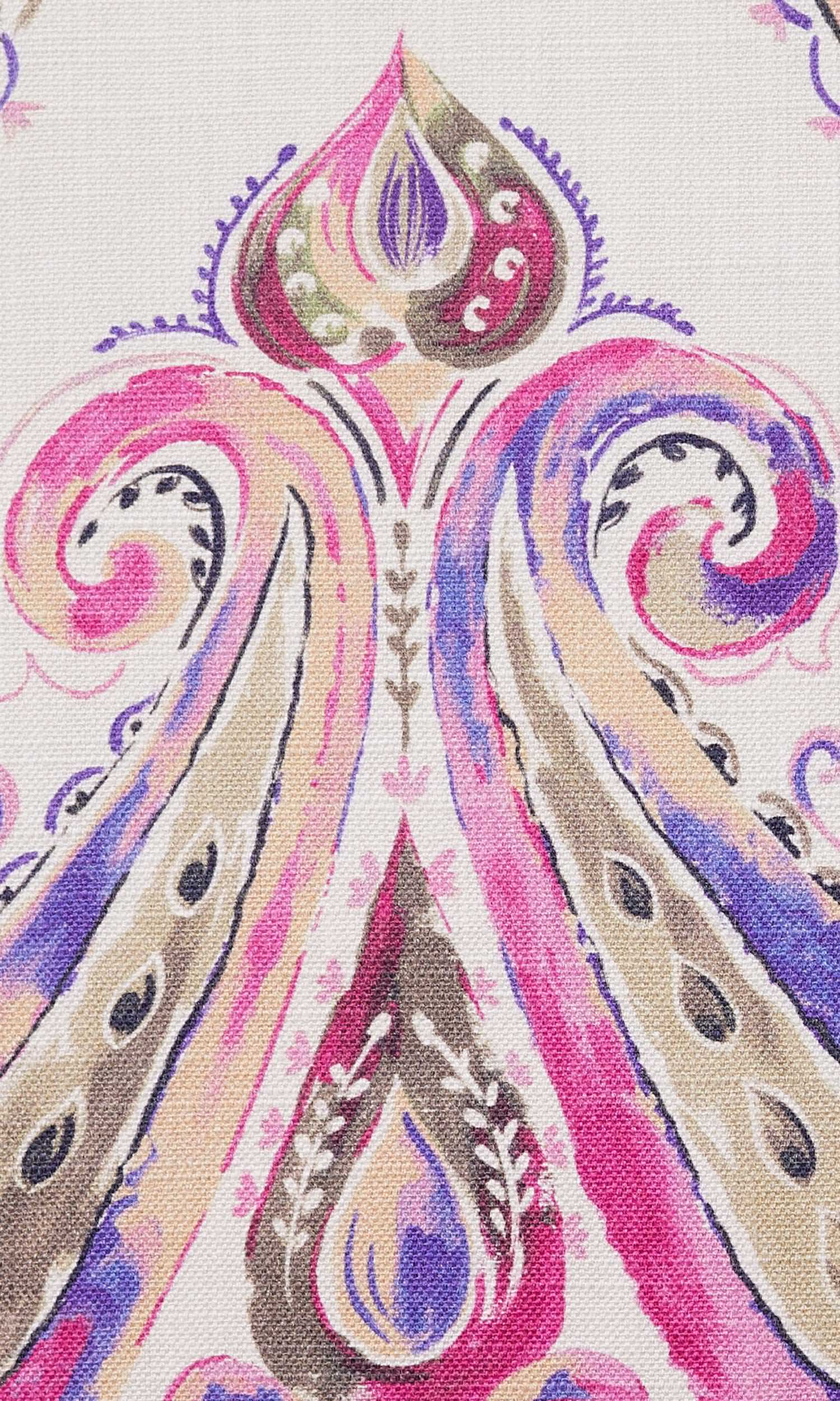 Traditional paisleys take an eye-catching avatar in this fabric. A charming palette of springtime pinks and purples with touches of brown and black on a pristine white backdrop looks absolutely magnificent. Simply perfect if you want to raise your room's elegance quotient!