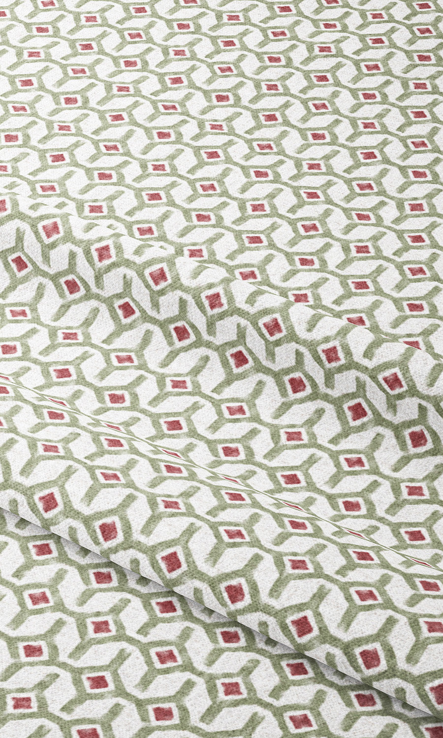 • Its lighthearted palette of green and deep red, bringing both freshness and warmth