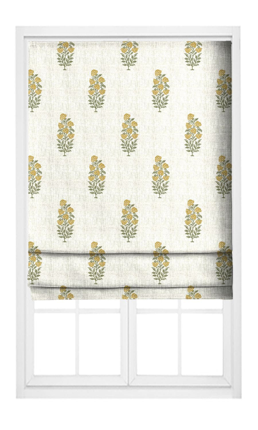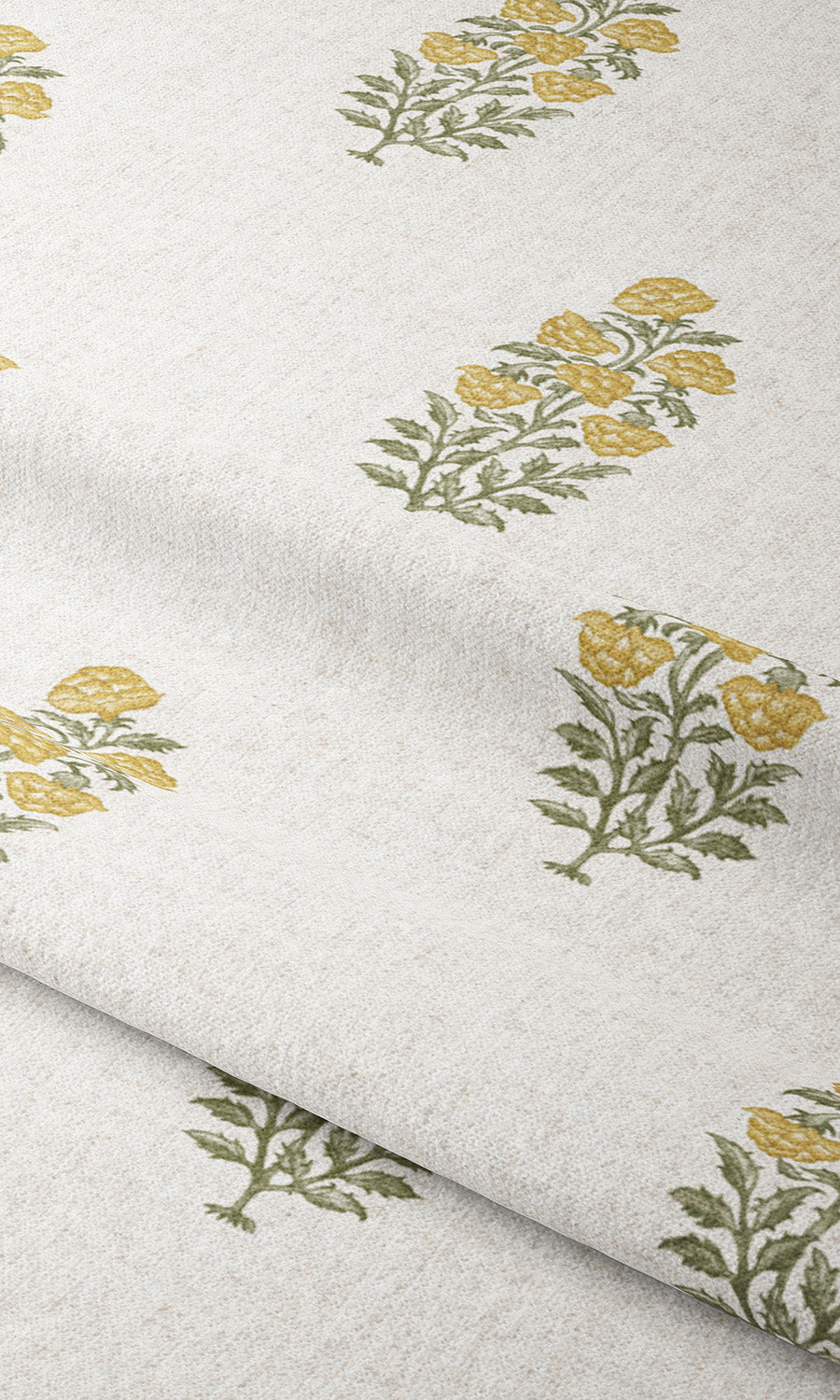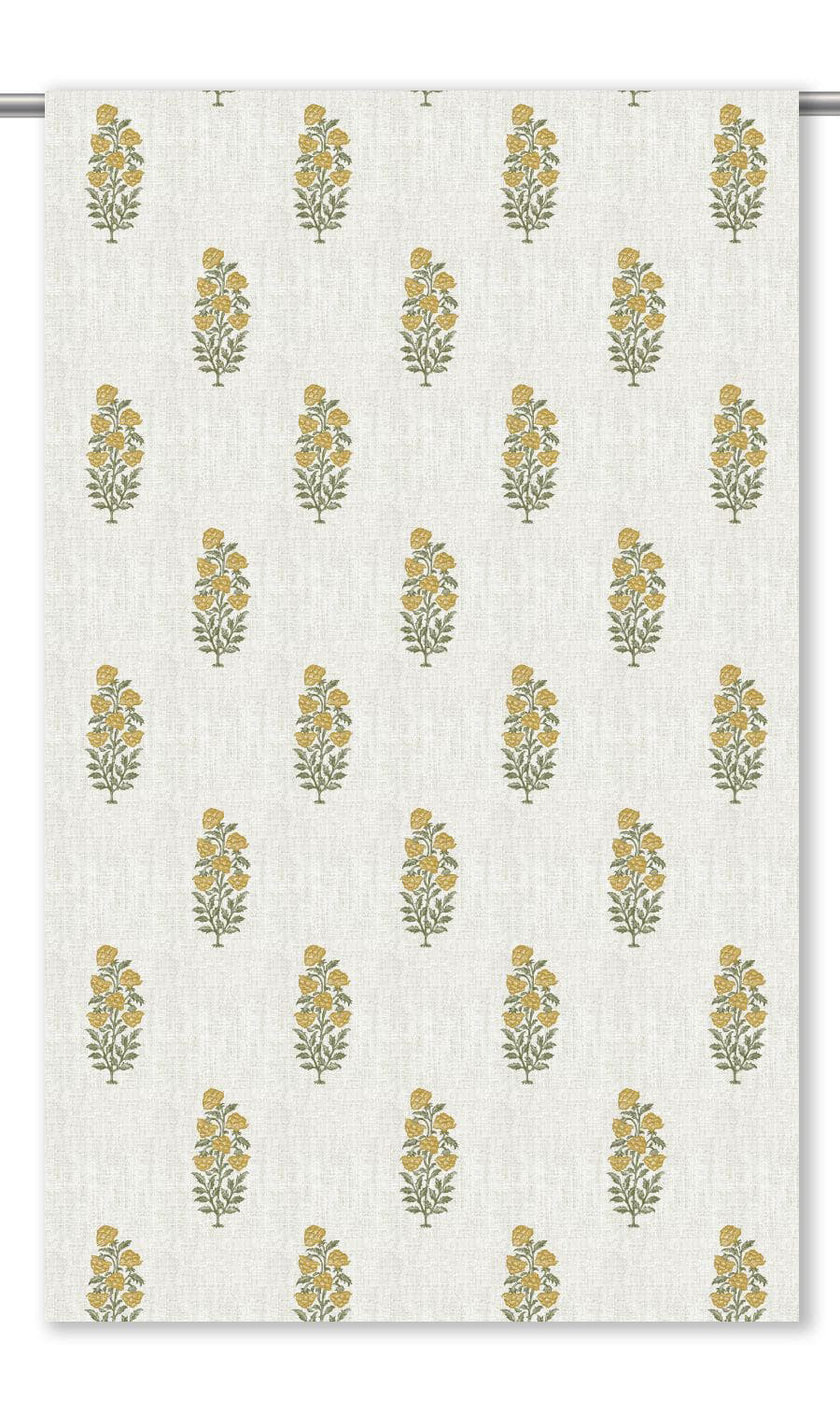 • A parchment white canvas where yellow and green stage a floral tableau with delicate elegance