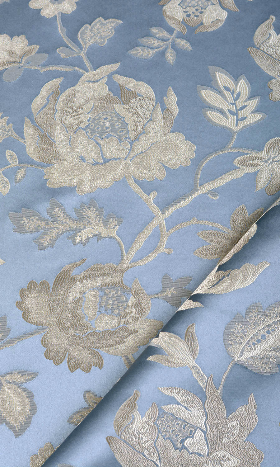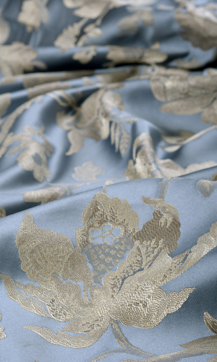 When you want your room to acquire a stately ambience, opt for this beautiful floral damask fabric. Its indigo blue backdrop is self patterned with palest gray-beige in fabulous floral pattern for a truly impressive look. We recommend pinched pleated curtain style for maximum impact.