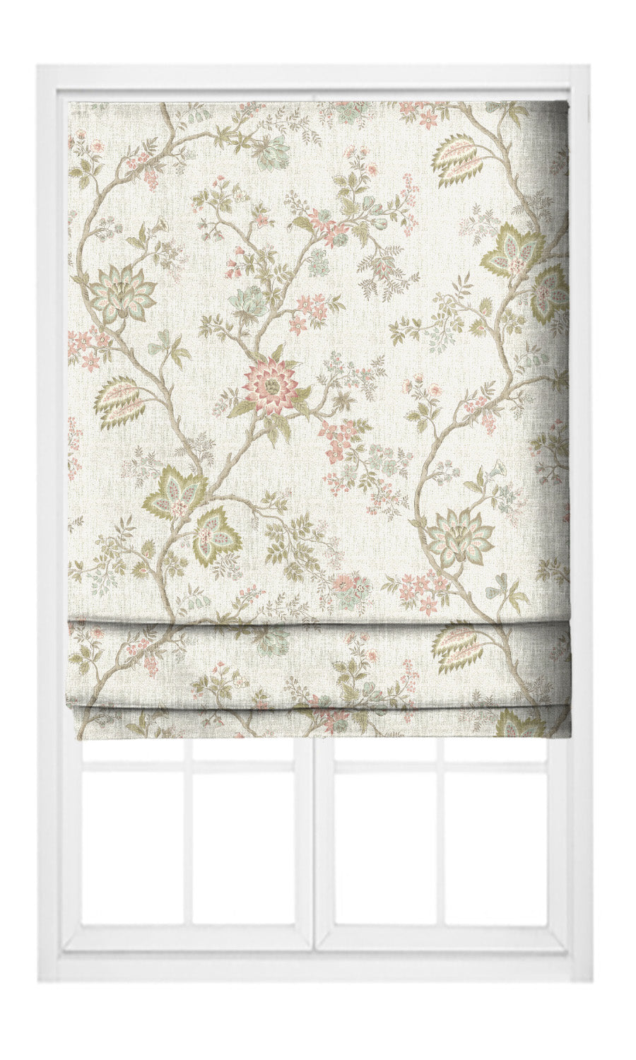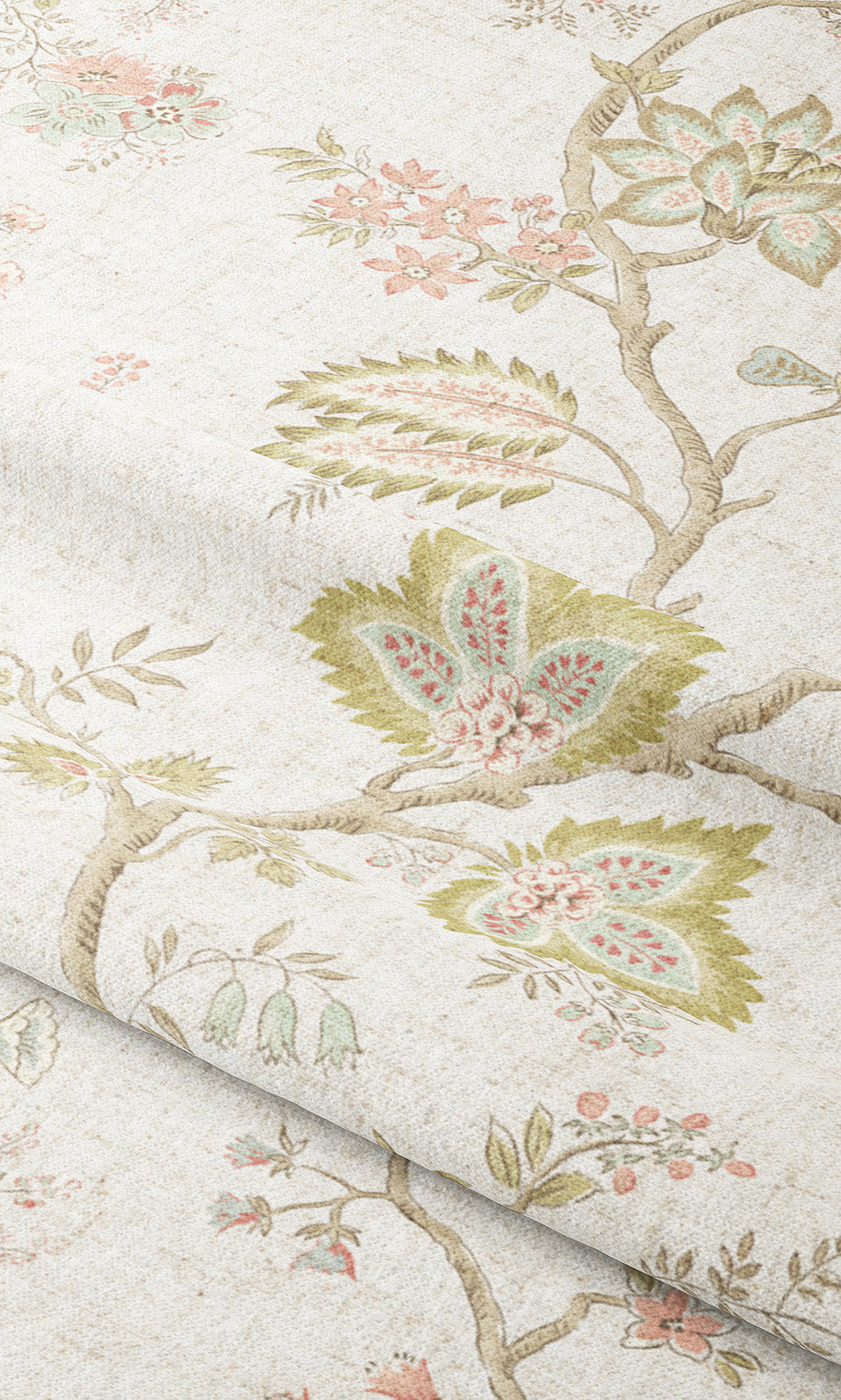 • Its serene cream canvas where blush pink, powder blue, and sage green bring a charming garden alive
