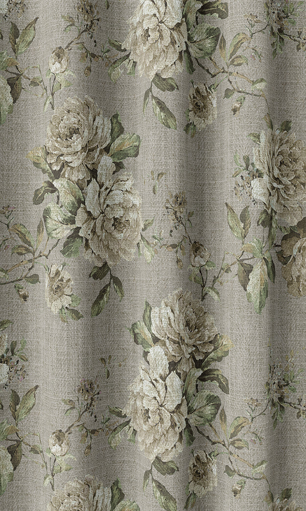 Brighten your home with the freshness of a Spring morning! Set in a greige backdrop, the off-white roses featured on this fabric can bring the serenity of a blooming garden indoors. The vintage French floral pattern paired with a modern color palette makes window treatments in Belgian a timeless decor element. Drapes and roman shades stitched of this lovely fabric promise to render softness and feminine touch to any interior.