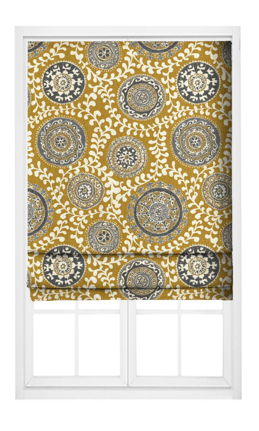 'Bellica' Ajrakh-Style Floral Print Custom Roman Shades (Mustard Yellow/ Gray)