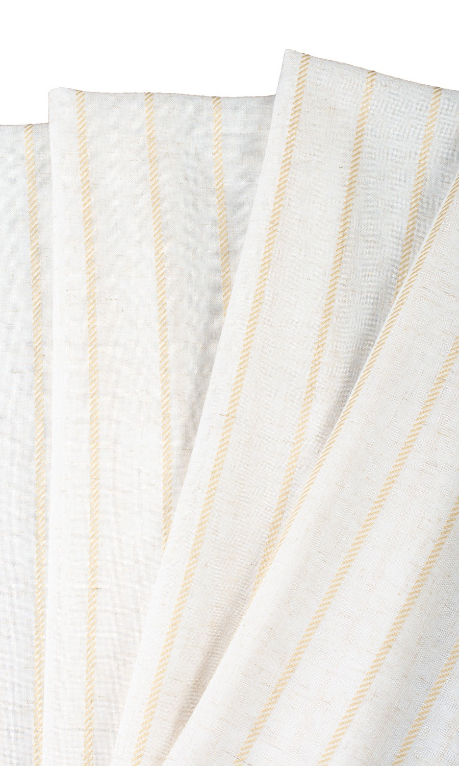A lovely warm white linen sheer that offers a one-of-its-kind elegance with its mustard beige stripes. Slight indulgence in color and pattern and a ton of slubbed texture proffer a rich personality while keeping to a minimal appeal. Dress a rustic home, a country kitchen or even a modern home that loves a pinch of color with casual charm while being assured of a wrinkle-free sleek aesthetic by the lasting partnership of linen and polyester.