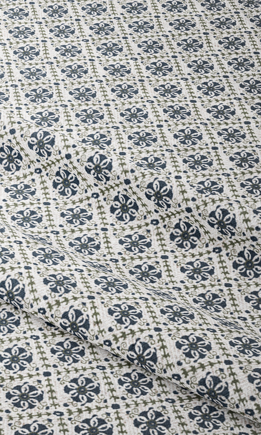 - Dark blue blooms with vitality, green crisscrosses with grace, and white grounds the floral tableau