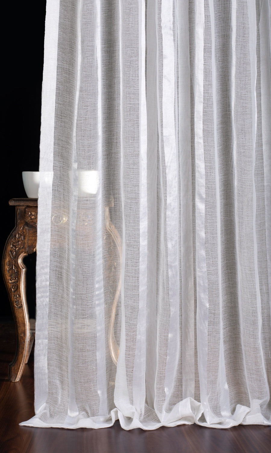Merging a neutral hue and a streamlined pattern, this white sheer with wide vertical stripes is a versatile piece that can mingle with many palettes, patterns and decor styles. The ribbon stripes not only bring in pattern play but also add visual depth with their lustrous textural quality. As it filters light and air, it lends its pattern to the interiors of the home, casting dramatic striped shadows, and elevating a decorative detail into a delightful visual display.