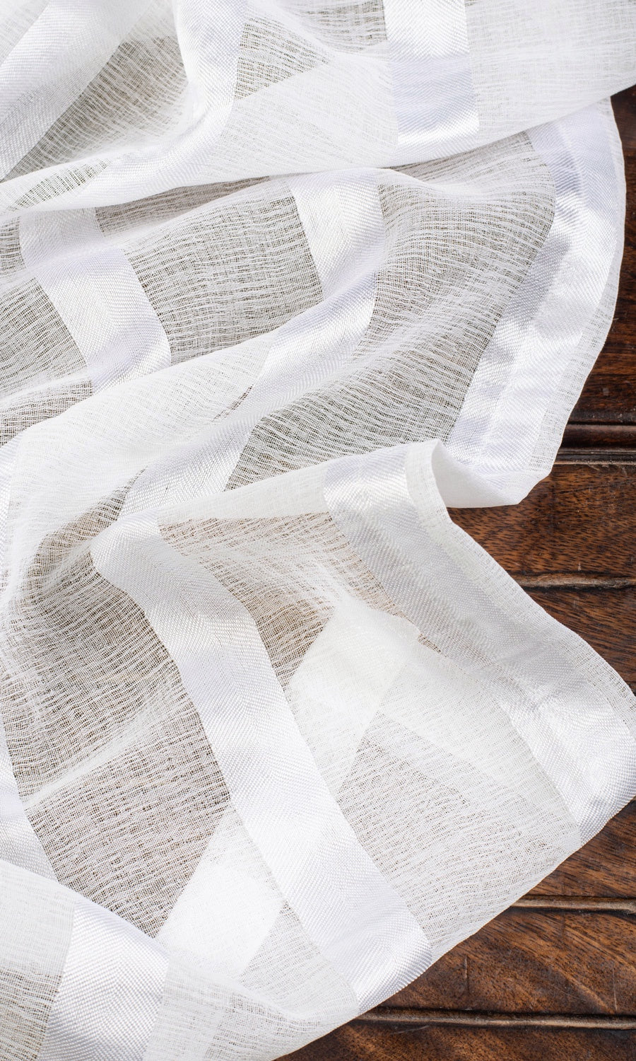 Merging a neutral hue and a streamlined pattern, this white sheer with wide vertical stripes is a versatile piece that can mingle with many palettes, patterns and decor styles. The ribbon stripes not only bring in pattern play but also add visual depth with their lustrous textural quality. As it filters light and air, it lends its pattern to the interiors of the home, casting dramatic striped shadows, and elevating a decorative detail into a delightful visual display.