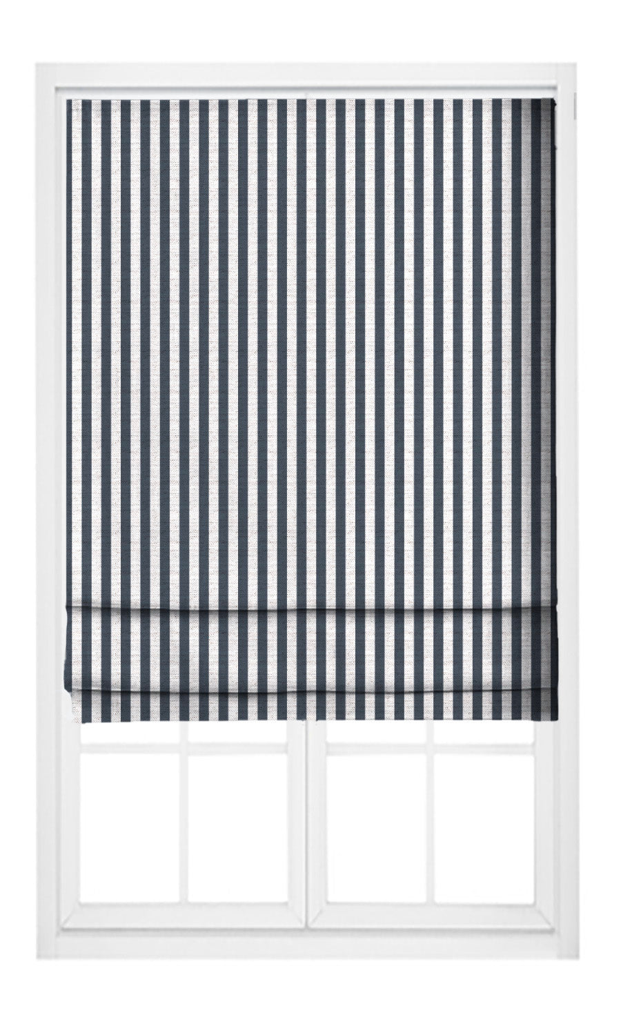 - Build on the nautical theme: Adorn a nautical home with Brush Blue navy blue striped roman shades. Pair them with sandy tones, wooden textures, and hand-woven elements, capturing the nostalgic charm of maritime tropes.