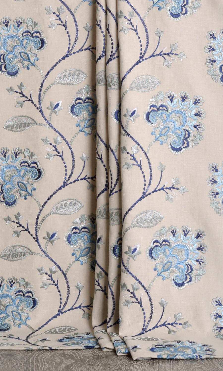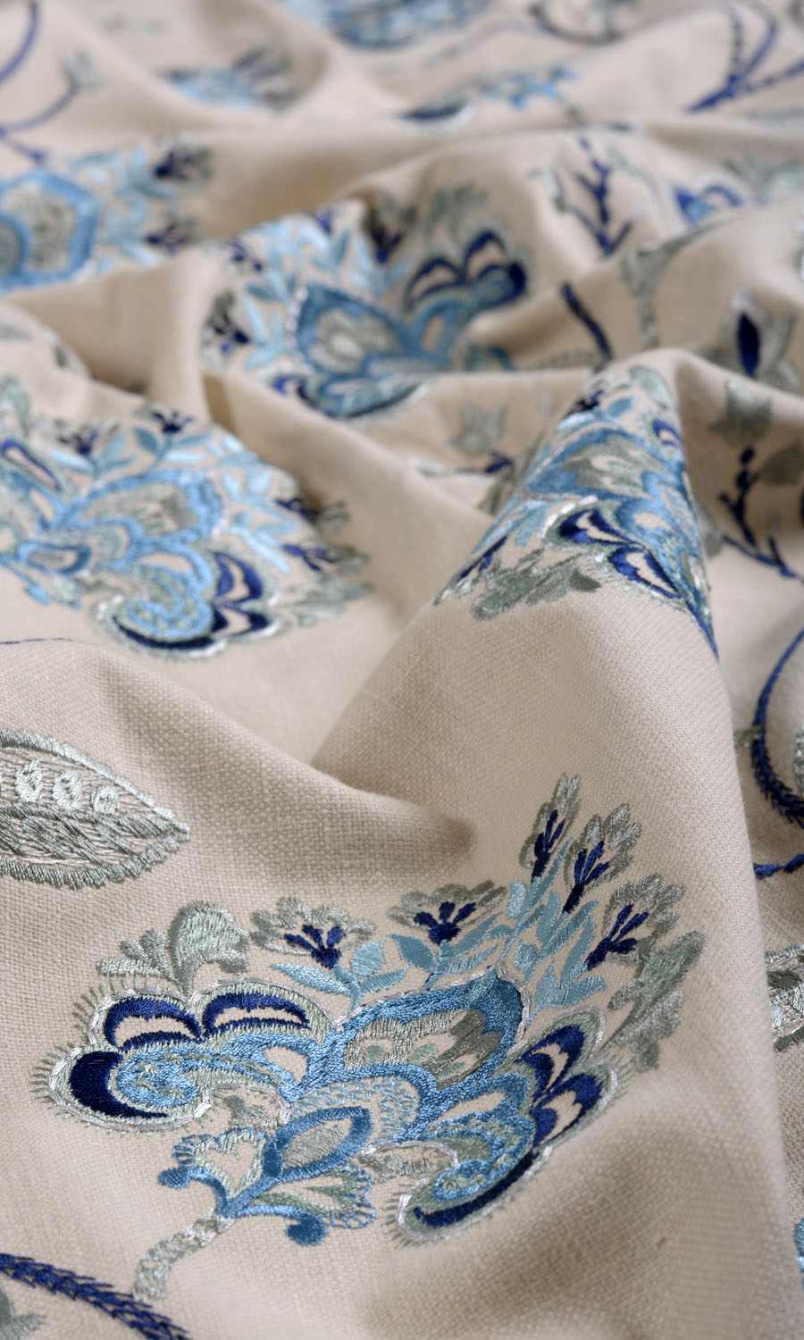 If there is a fabric with unabashed swagger, surely it is the Calm Seas. The beige backdrop of this polycot fabric is embroidered with multiple shades of blue. The elaborate floral pattern with vines, tendrils, buds, leaves and blooms gives an enchanted garden look that's perfect to go with an elegant decor.