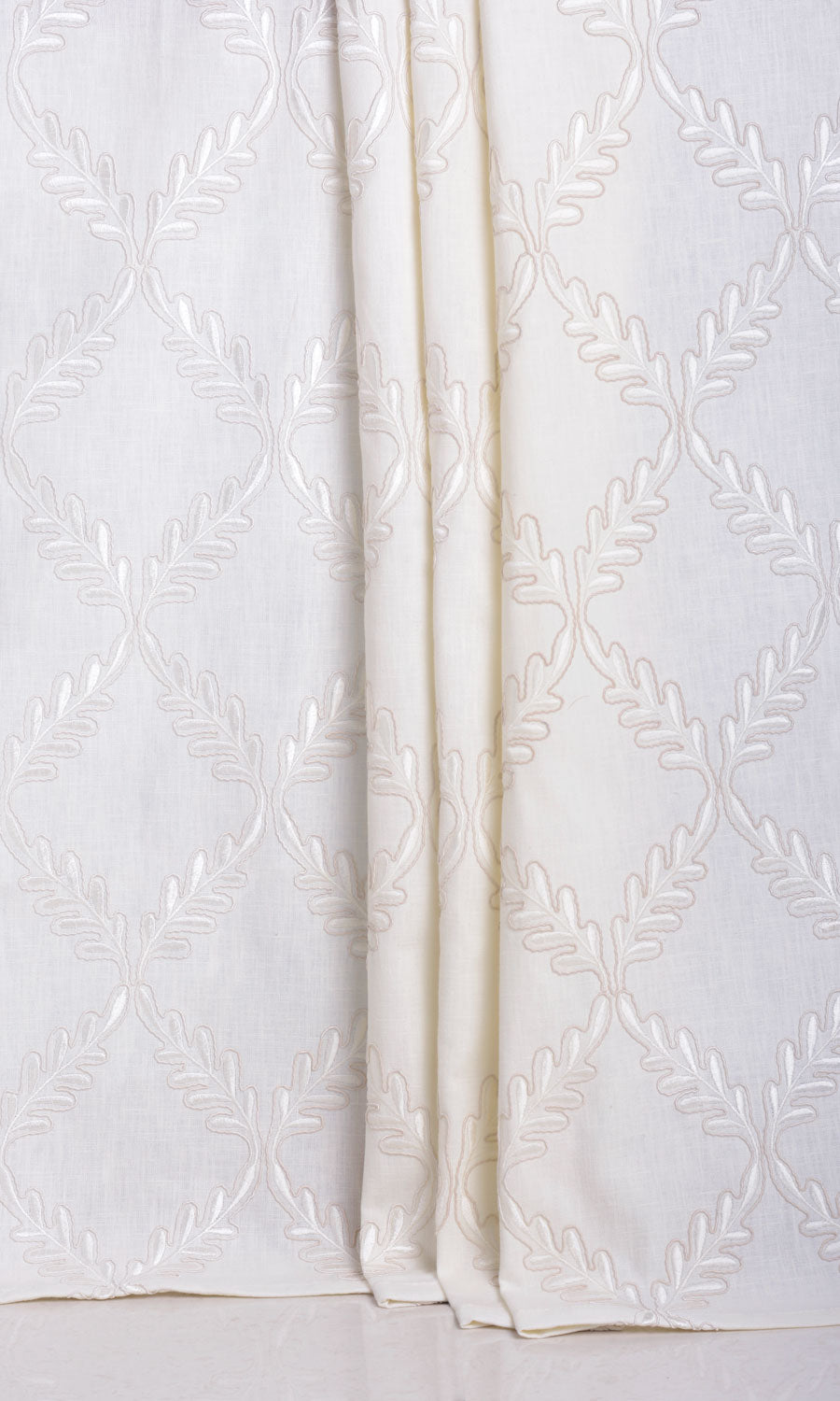 Those who love geometric patterns as passionately as floral designs can now gratify their design aspirations in this linen-blend. Slender sprigs move rhythmically from top to bottom caving in at intervals to form a harlequin pattern. Window treatments in this white fabric with tone-on-tone cream embroidery make a gorgeous visual treat with subtle contrasts.