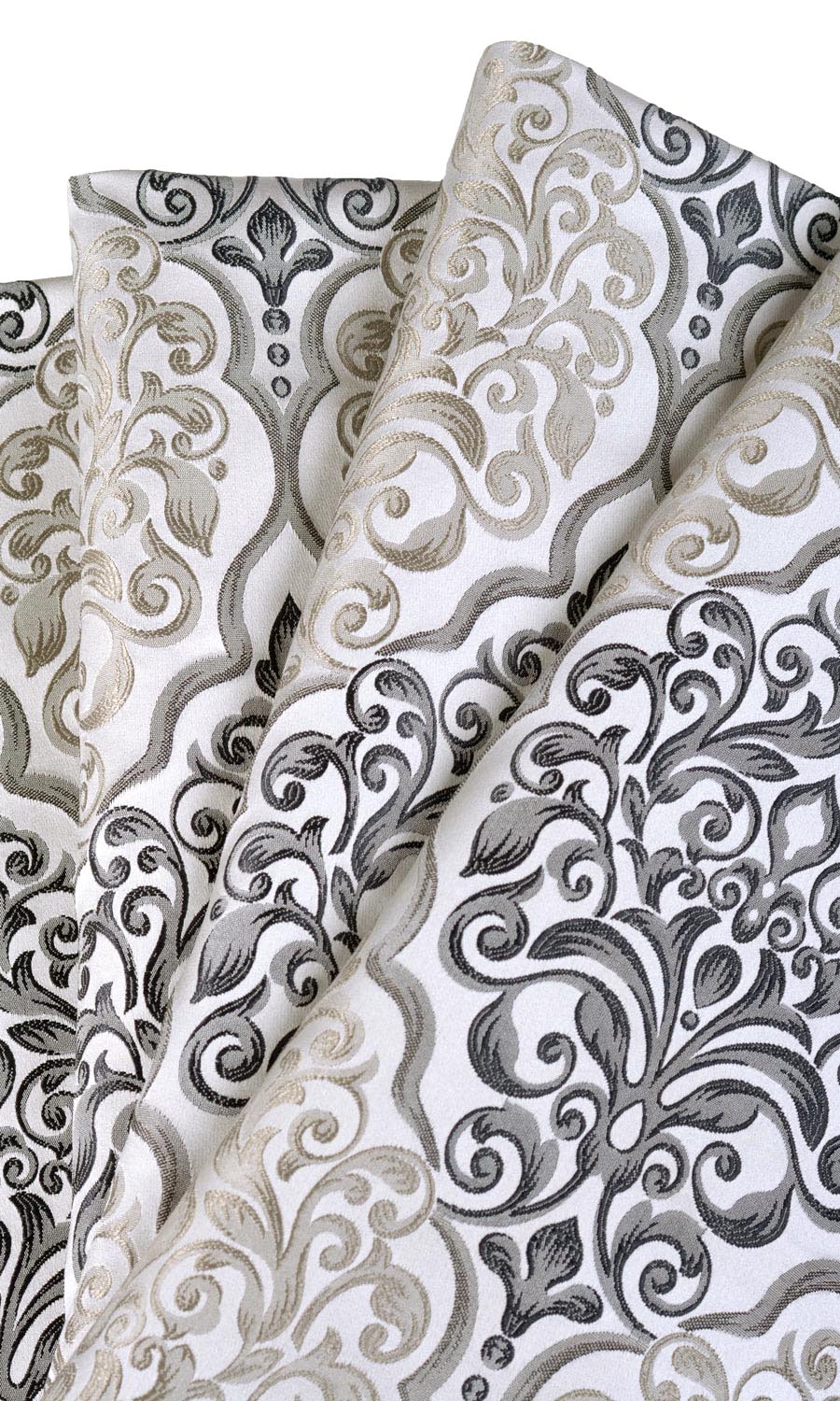If dramatic and glamorous are the guiding points of your decor style, opt to dress up your room with this captivating fabric. A gorgeously self patterned damask in beige and black, it features alternate rows of a lovely vine and trellis motif in dark and light weaves to a stunning look. We recommend pinched pleat style curtains for highest possible impact.
