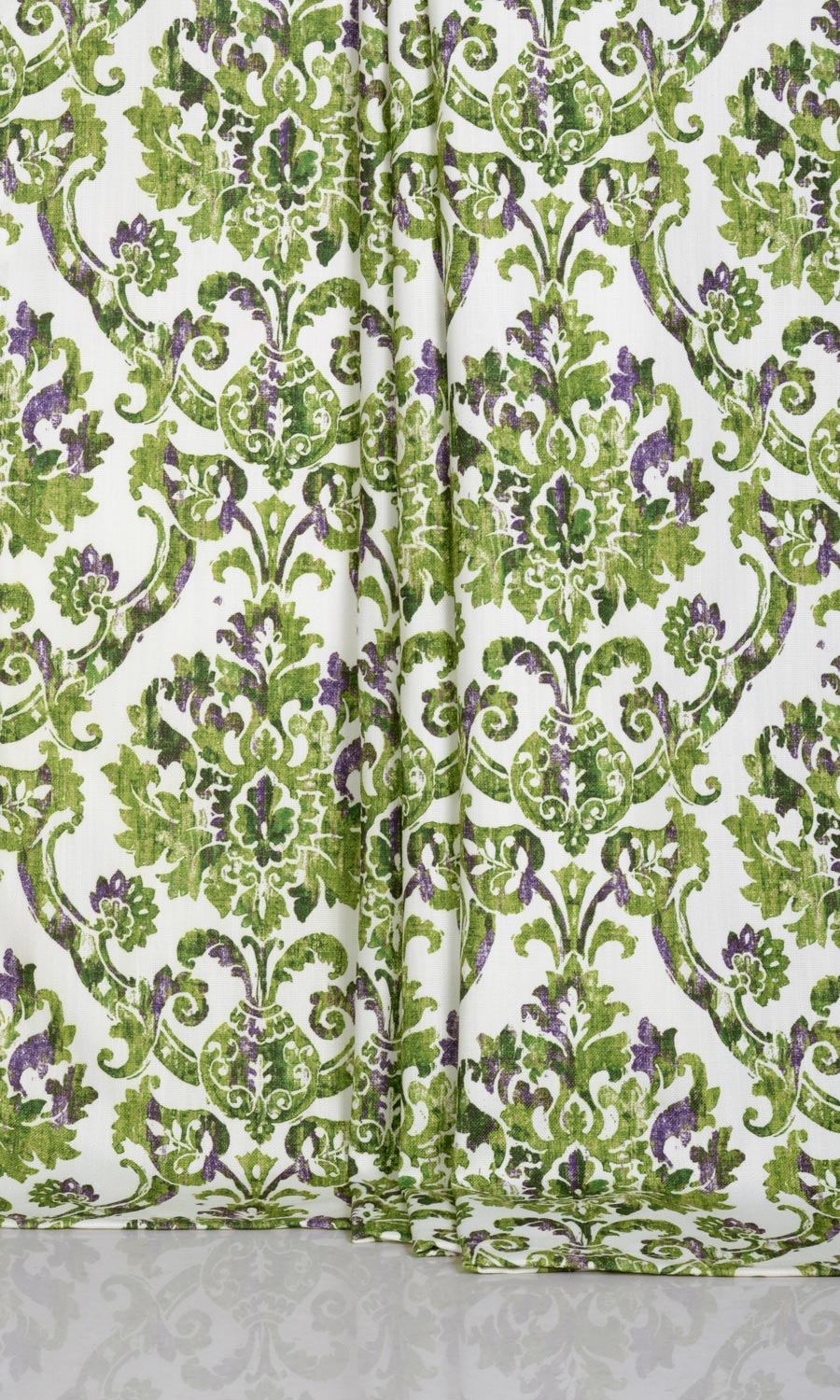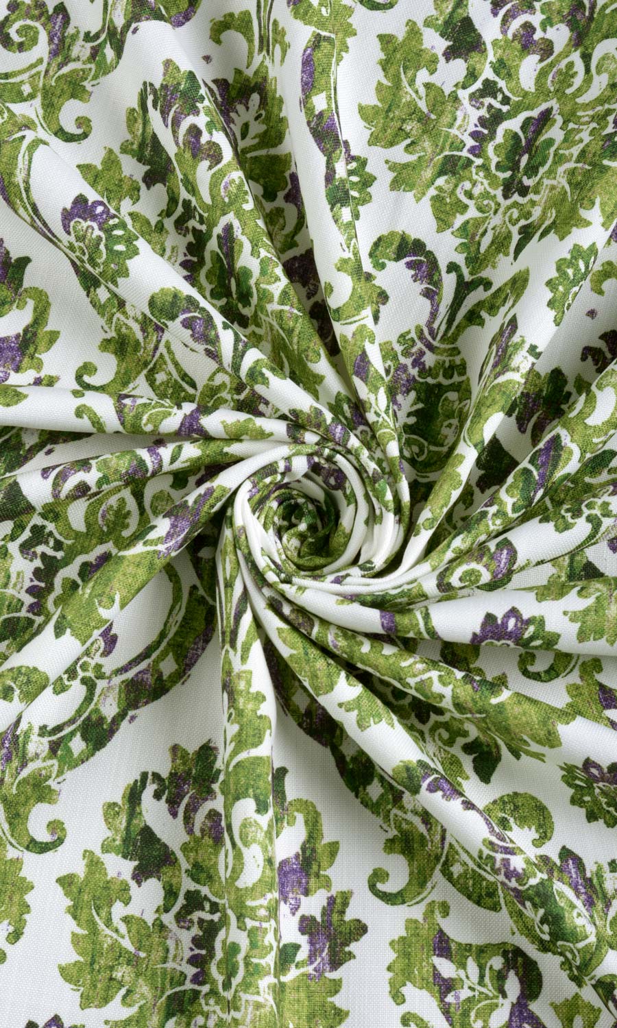 For elegant window treatments that must also make a strong visual impact, this immaculate piece of luxe beauty is on offer. Bearing the traditional and much-revered damask motif in olive green and eggplant purple on a white backdrop, this fabric is best described as an enchanting beauty. Drapes and roman shades in this bold patterned fabric are ideal for traditionally-styled large rooms and open-plan houses.