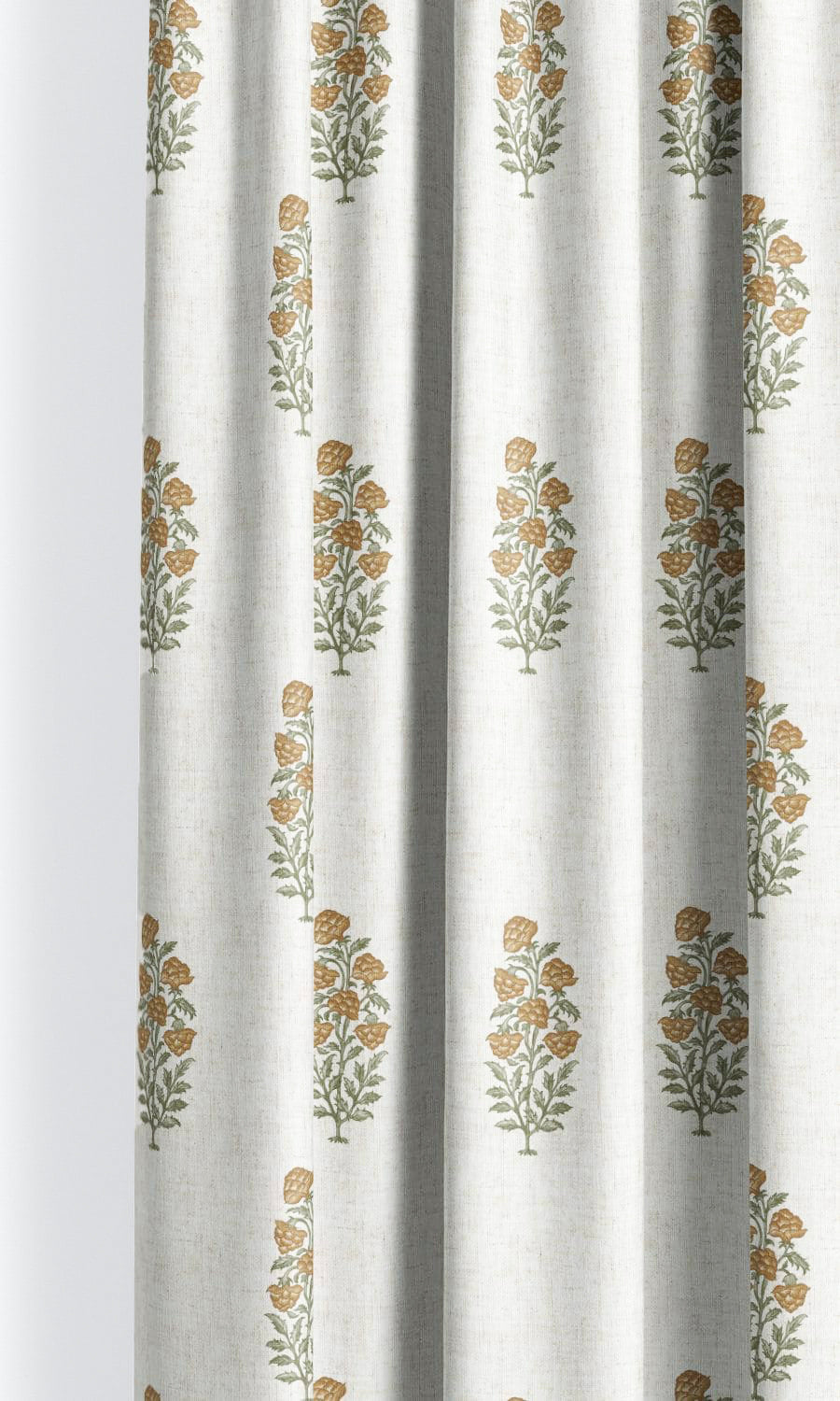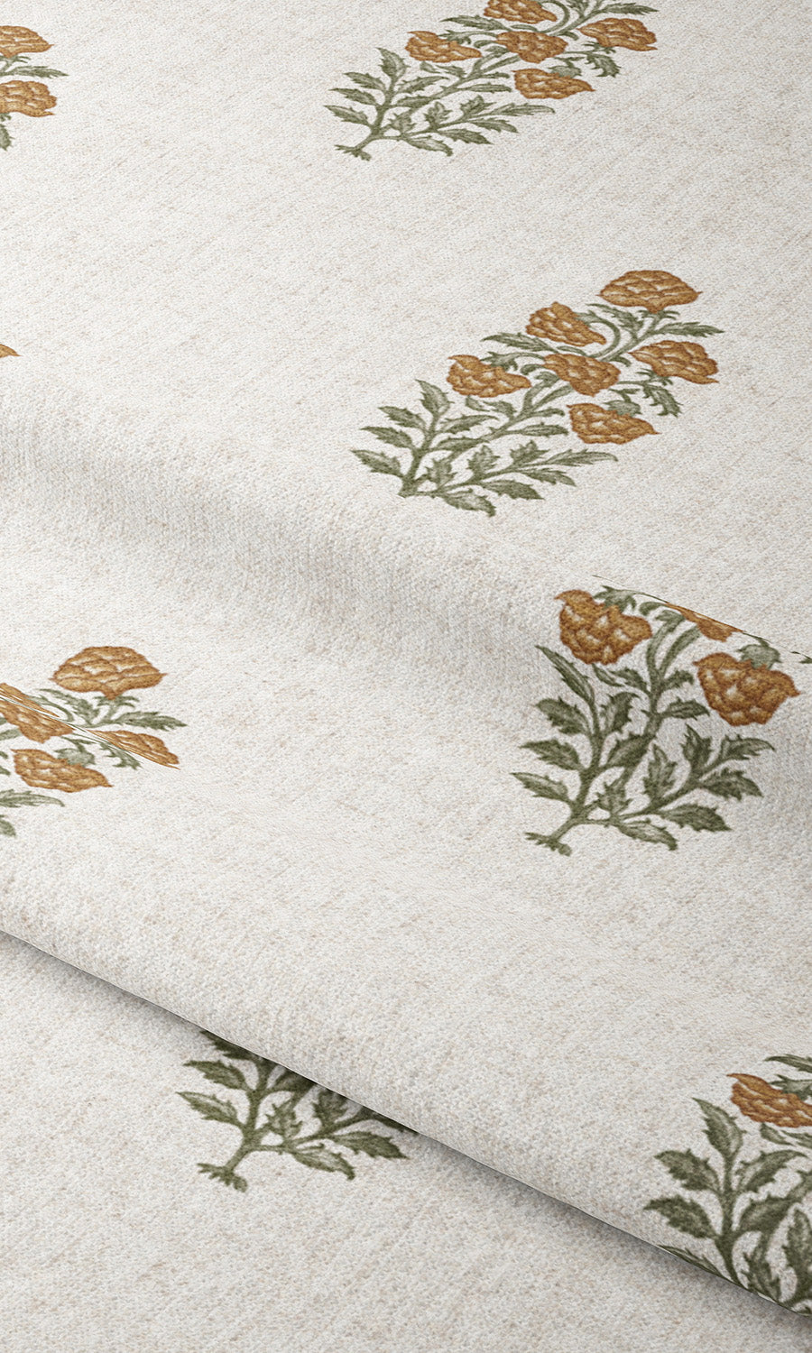 - A parchment white canvas where orange and green stage a floral tableau with delicate elegance