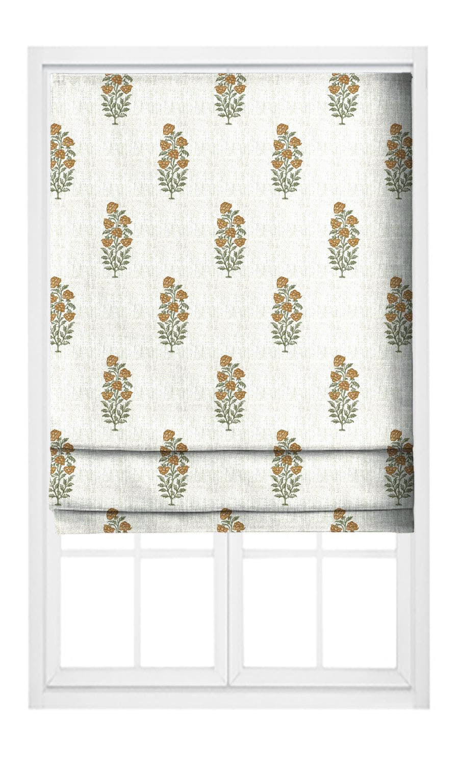 - Decorate the border with trims: Finish Caramel Corn roman shades with orange border trims to add color, texture, and handcrafted charm. Like reeds and blooms swaying in the breeze, trims bring a whimsical flourish that enhances the natural poetry of the fabric's floral motif.