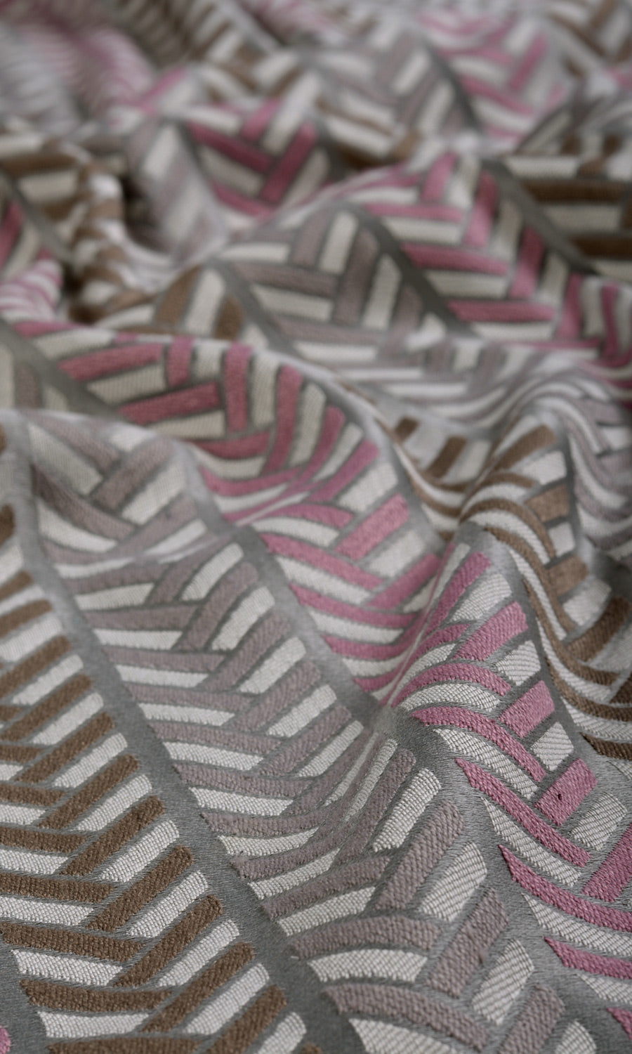 Carbon Flint celebrates symmetry and harmony with its cool color palette and horizontal herringbone design. Its grey base is patterned with columns of herringbone zigzags in pink, brown and charcoal grey. This simple yet stunning fabric can visually elongate your windows. We recommend it for draperies or roman blinds for a clutter-free space.