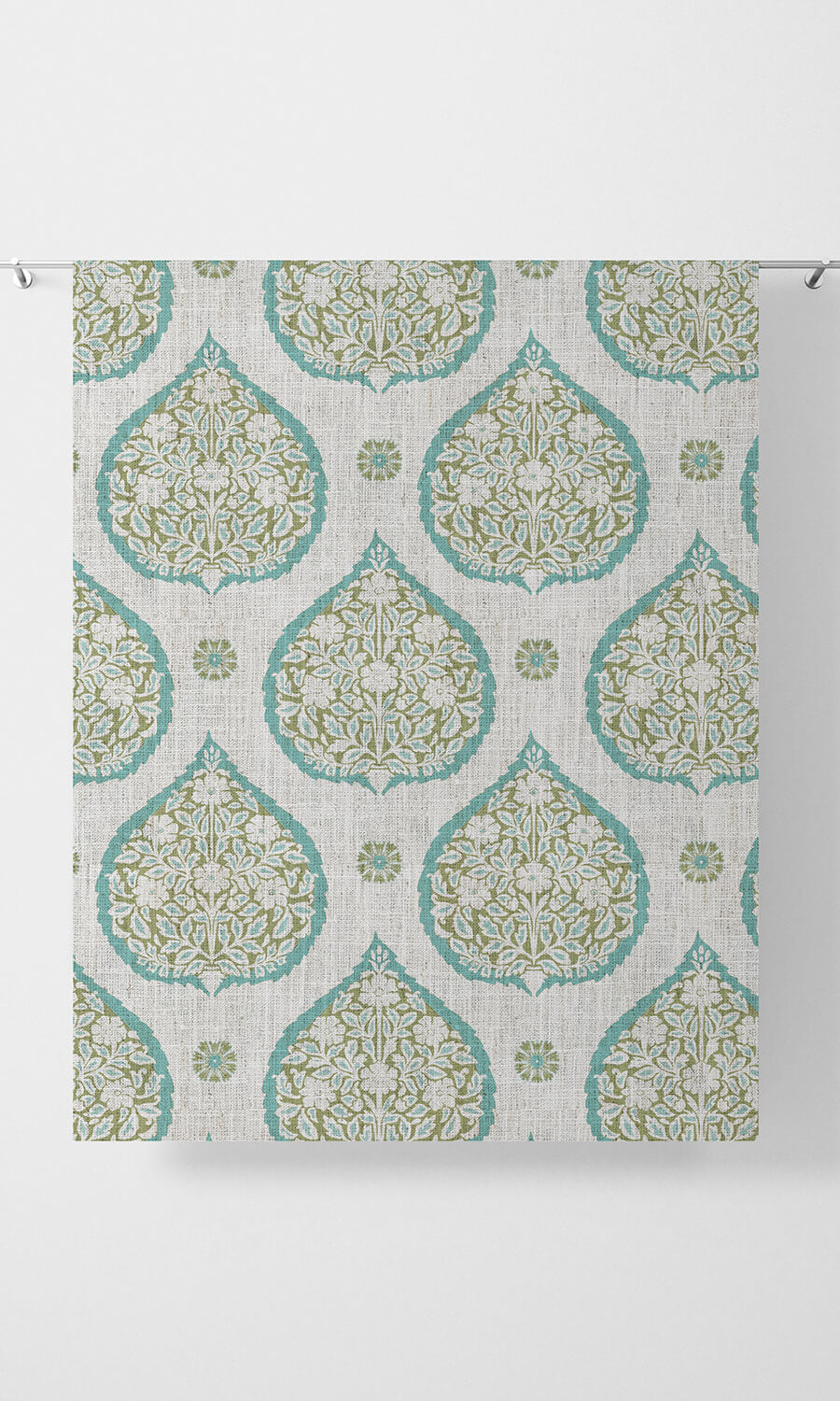 Welcome home a marvel from traditional Indian art with this classic fabric featuring ancient Mughal motifs in a modern palette of turquoise blue and olive green. Large cordate leaves interspersed with tiny scattered blooms offer an intriguing contrast of proportions while the narcissus shrub enclosed within the leaf delivers intricacy with sophistication. Window treatments in this paisley-inspired fabric are self-assured statement pieces.