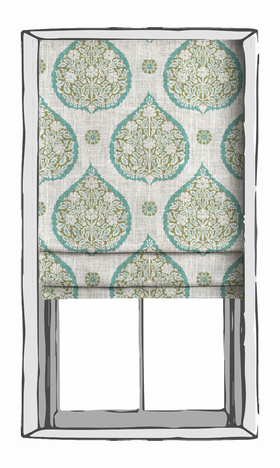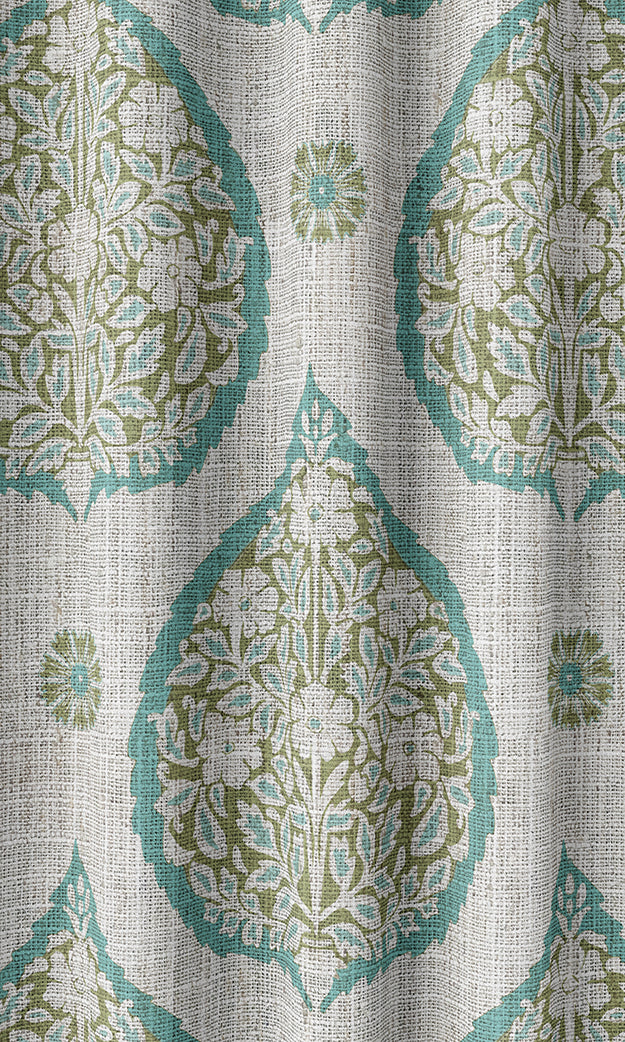 Welcome home a marvel from traditional Indian art with this classic fabric featuring ancient Mughal motifs in a modern palette of turquoise blue and olive green. Large cordate leaves interspersed with tiny scattered blooms offer an intriguing contrast of proportions while the narcissus shrub enclosed within the leaf delivers intricacy with sophistication. Window treatments in this paisley-inspired fabric are self-assured statement pieces.