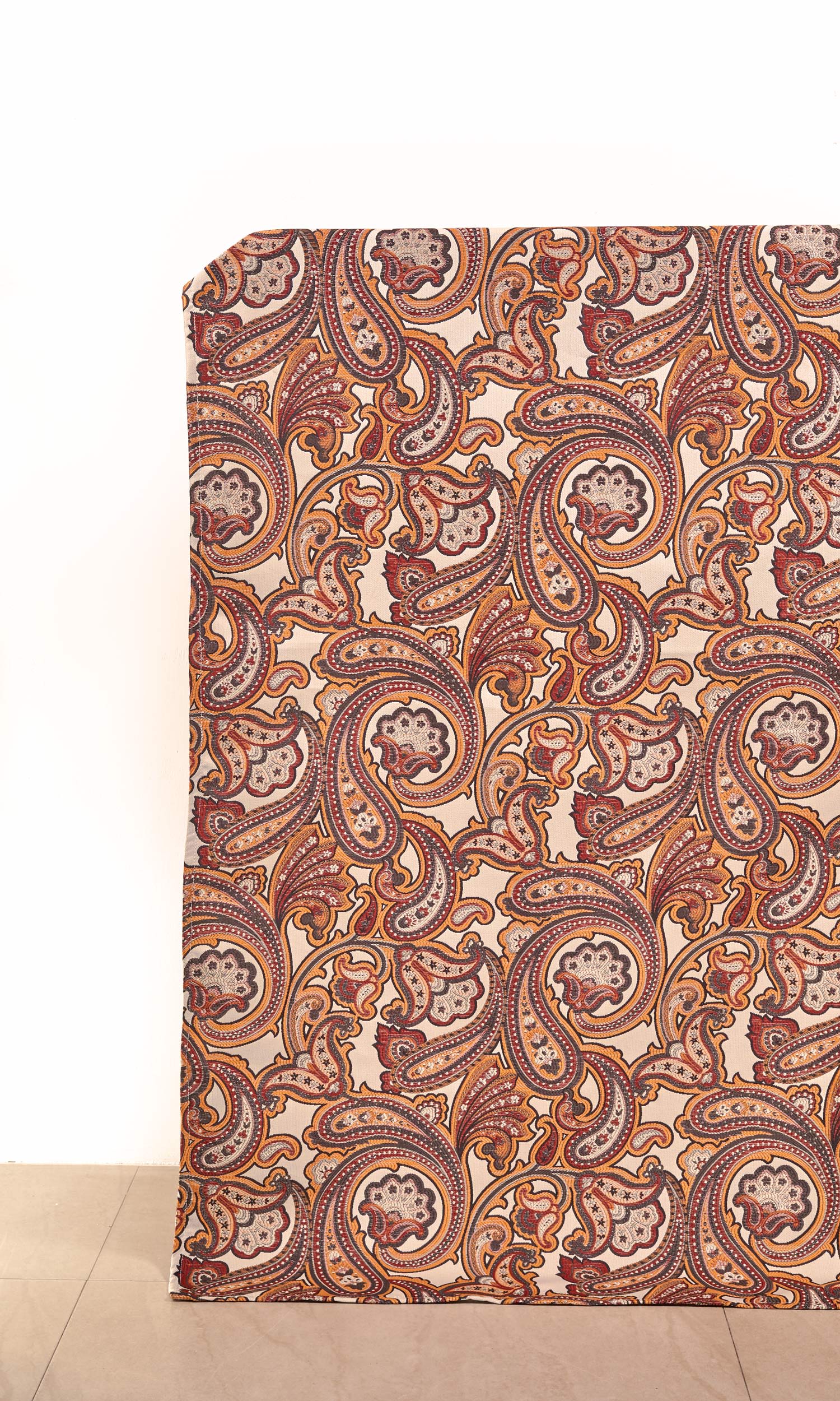 This ornate fabric has been intricately jacquard woven with a profusion of paisleys and blooms inspired by temple art of India. The rich earthen tones of burnt umber brown, russet red and deep yellow on a white backdrop evoke a warm and welcoming aura.