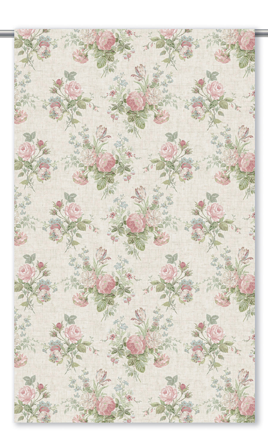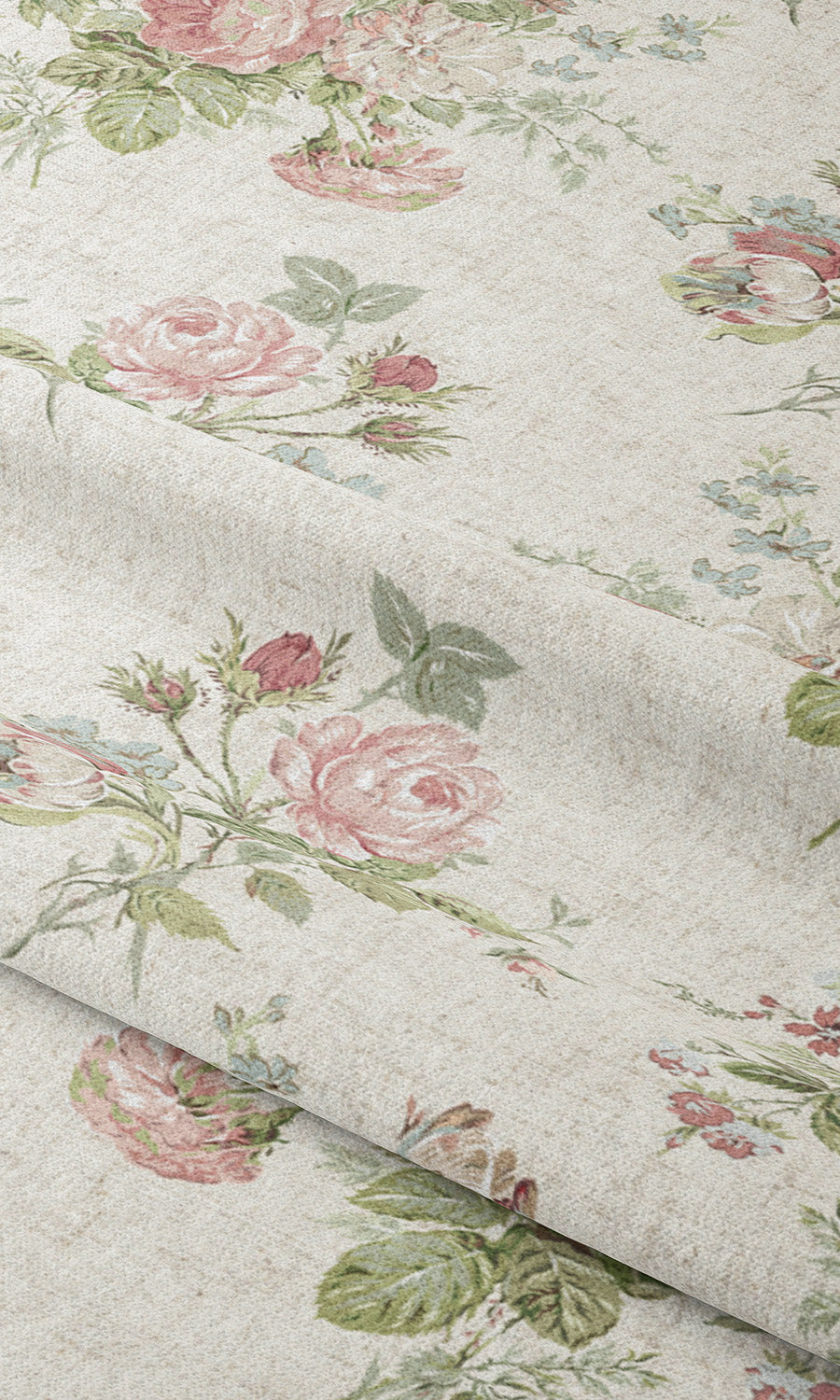 - Blush pinks and olive greens drift lightly over warm white, coaxing a garden into gentle bloom