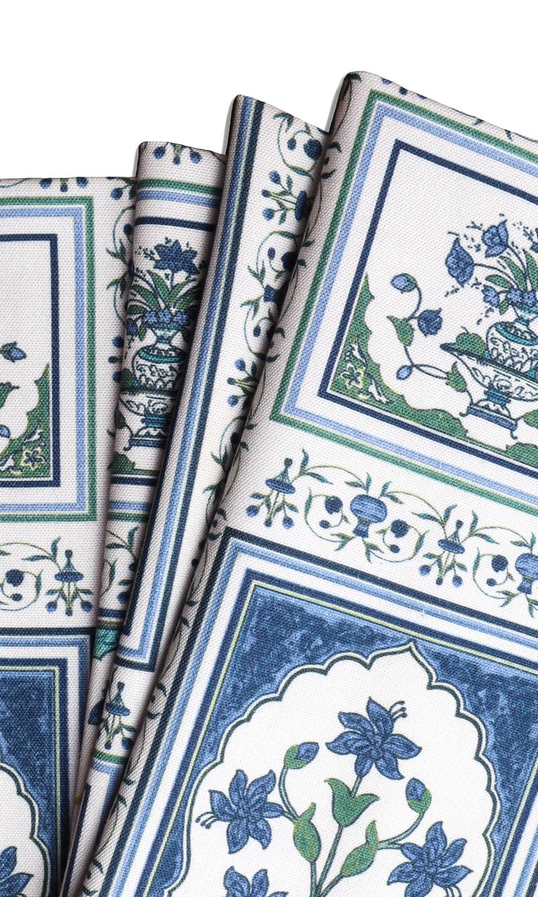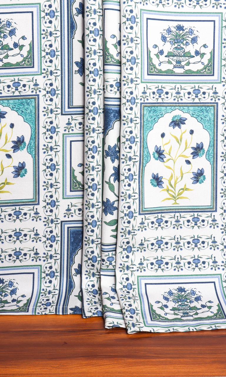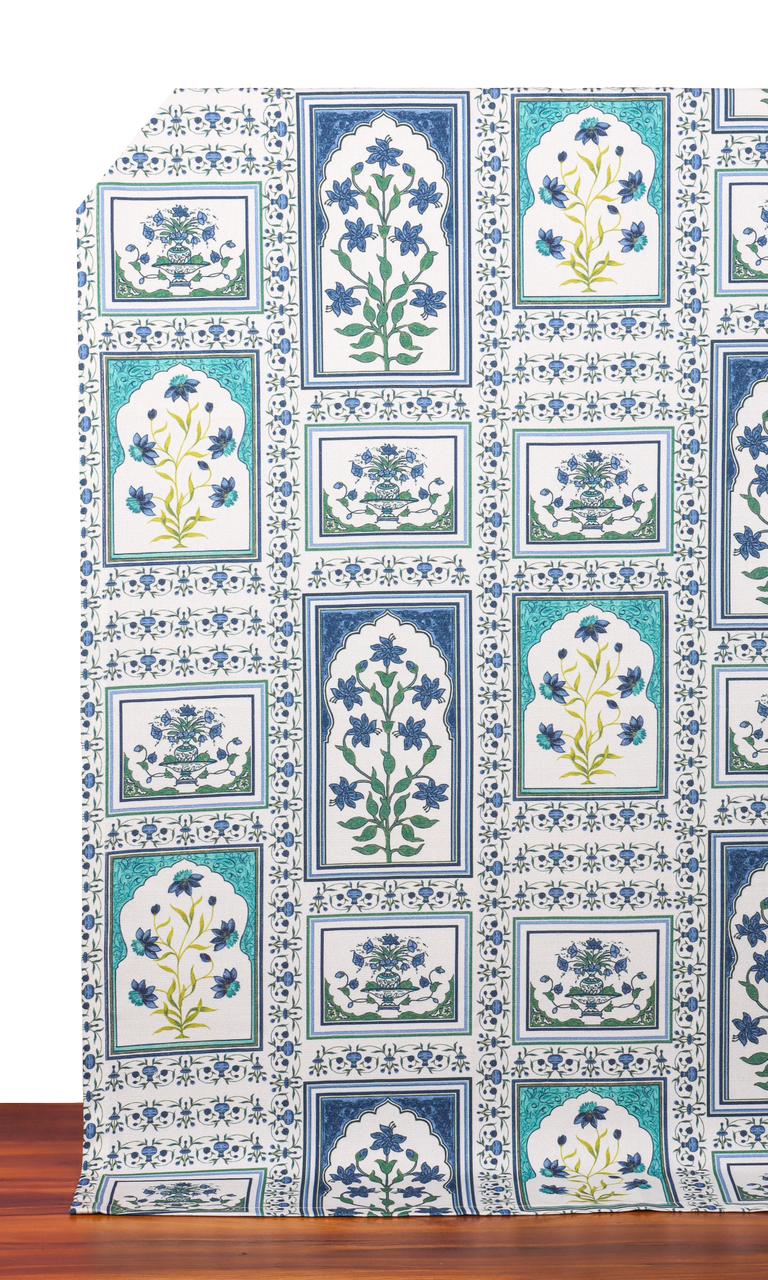 Take home a slice of India! This 100% cotton fabric teems with oriental themes of Mughal floral motifs and 'jharokhas' - the ornate oriel windows of classical Indian architecture. Inspired by the ancient art forms of the golden Thar desert, window dressings in this one-of-a-kind fabric will beautifully accentuate the eclectic bent of your maximalist or bohemian home.