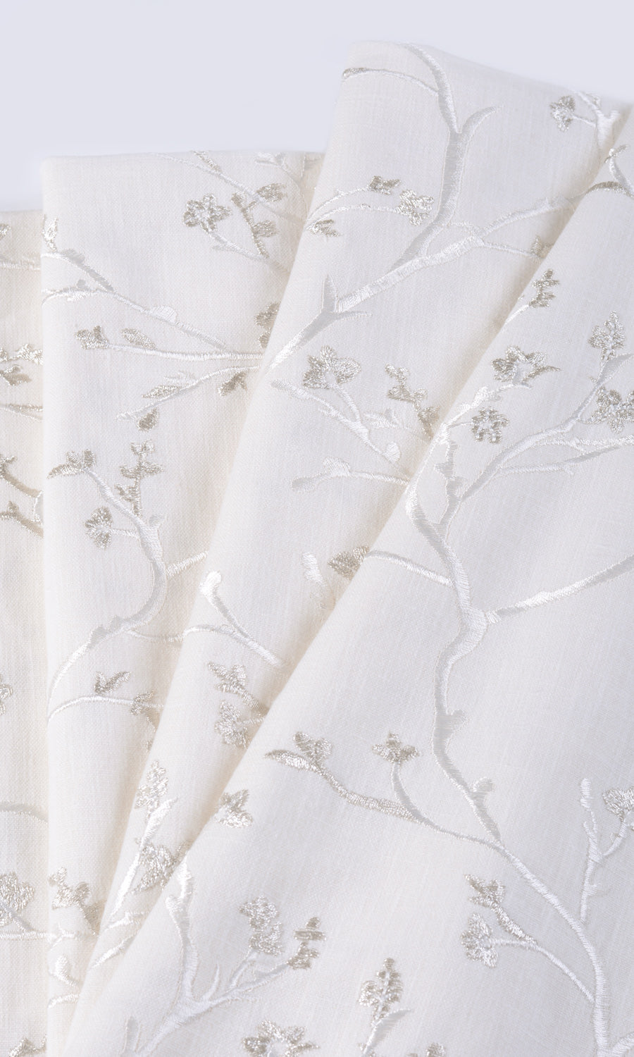 This embroidered fabric is an expanse of pure white with an all-over floral vine pattern done in pale and silvery grays. The base textile is a blend of cotton, polyester and viscose that gives sturdiness plus finesse.