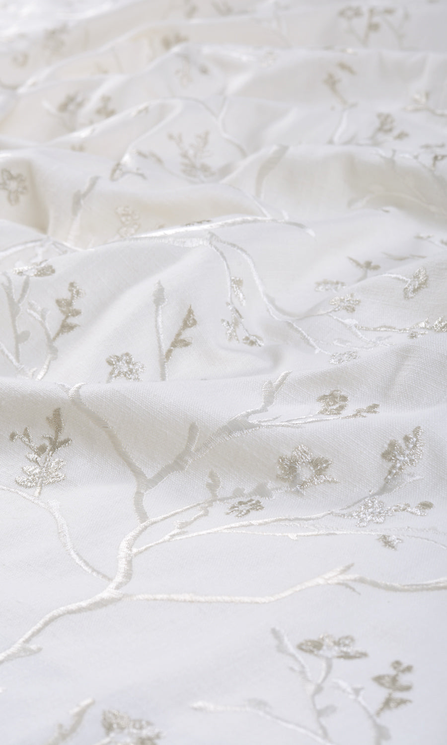 This embroidered fabric is an expanse of pure white with an all-over floral vine pattern done in pale and silvery grays. The base textile is a blend of cotton, polyester and viscose that gives sturdiness plus finesse.