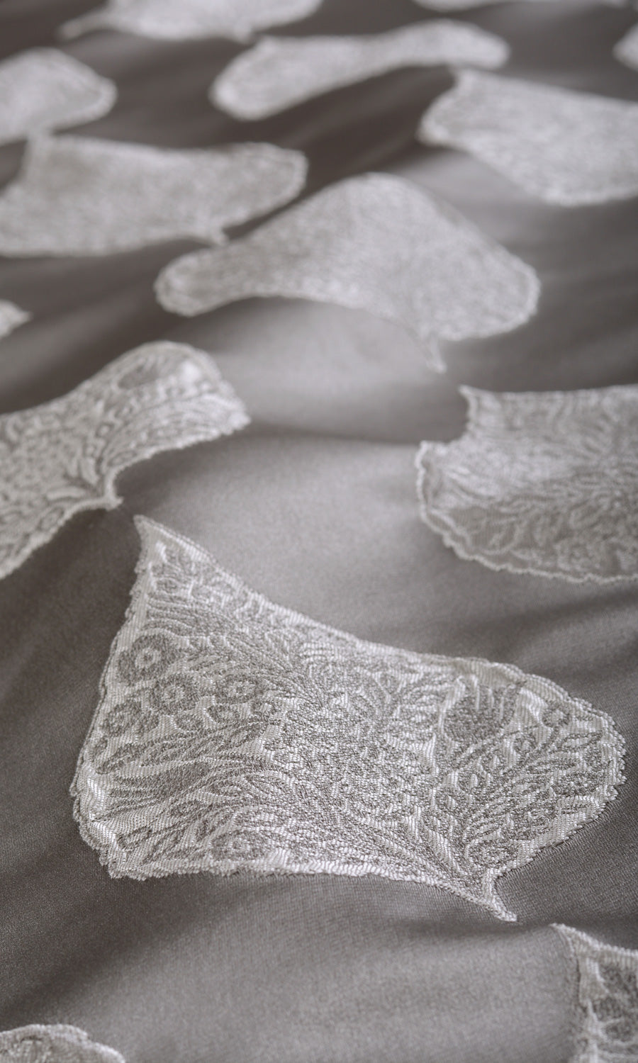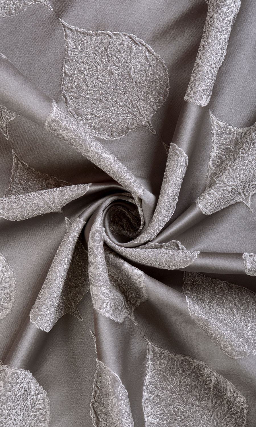If conventional floral draperies look just too common and geometric weaves leave you unimpressed, may we suggest Cordata? This pale gray woven fabric features a peepul leaf motif set in ogee style where rows of leaves create columns of curving arcs throughout. Each leaf is inset with intricate floral details as a decorative touch.