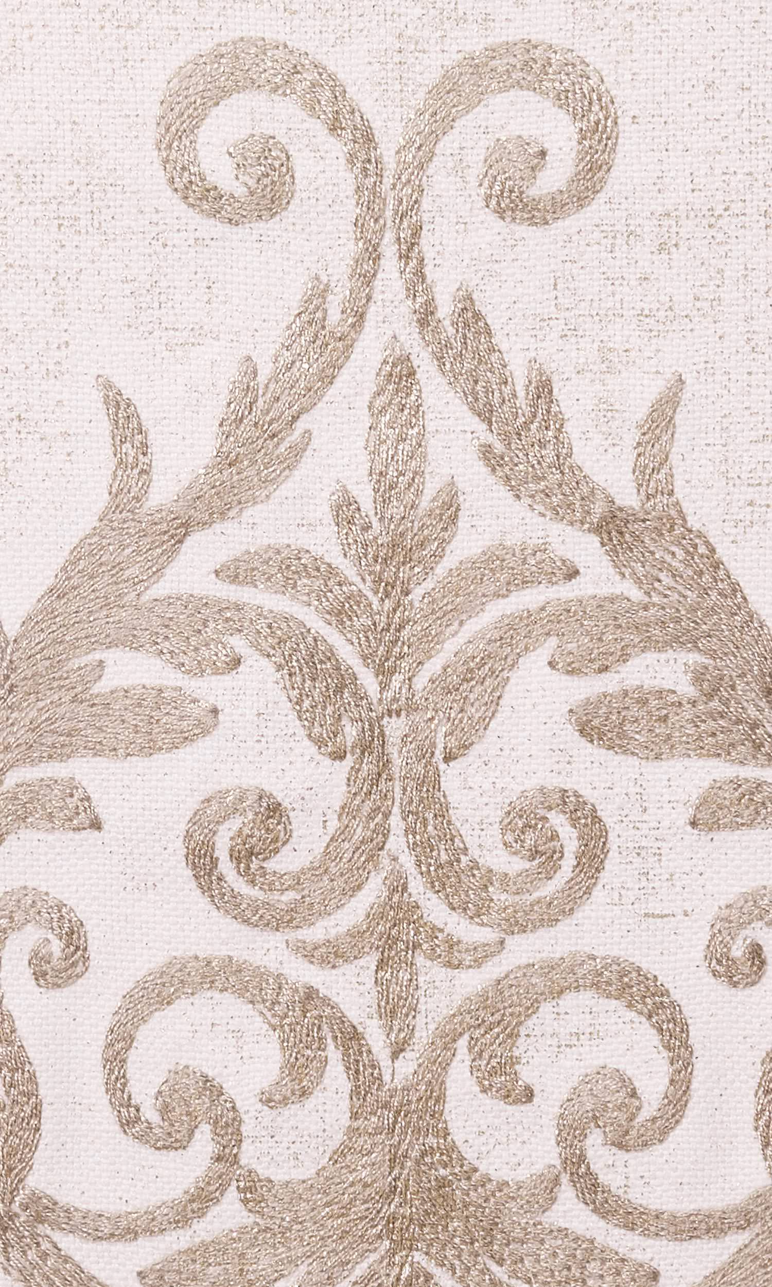 This truly sumptuous fabric features alternating rows of two classic motifs with rich tendril and curlicue elements for an alluring effect. These motifs are finely embroidered in soft golden thread on an ivory backdrop for a lavish and luxurious effect.