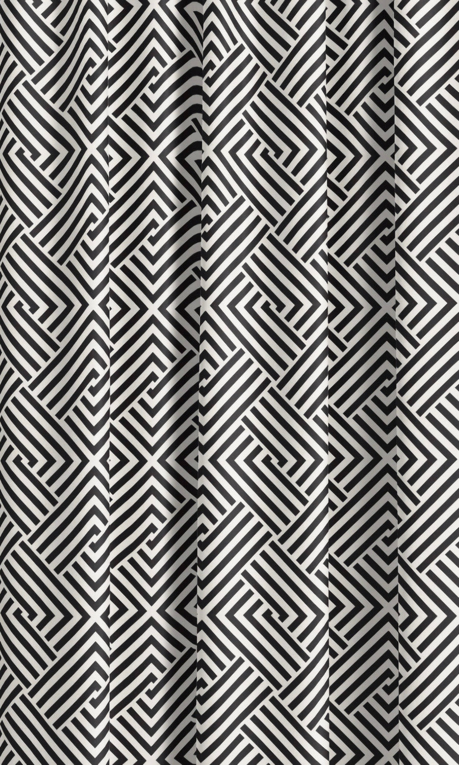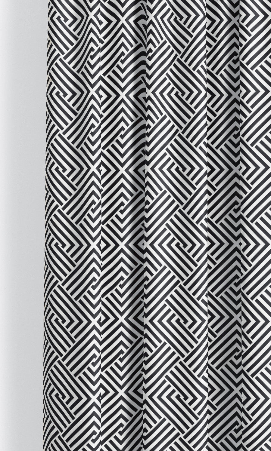 - Choose a streamlined heading style: Style these geometric maze print velvet drapes with sleek modern heading styles that speak to the contemporary flair of the pattern and the luxe appeal of velvet. Consider Euro pleat styles in formal rooms for their tailored gather and the flat panel tops for their straight, clean-lined pleats in semi-formal spaces.