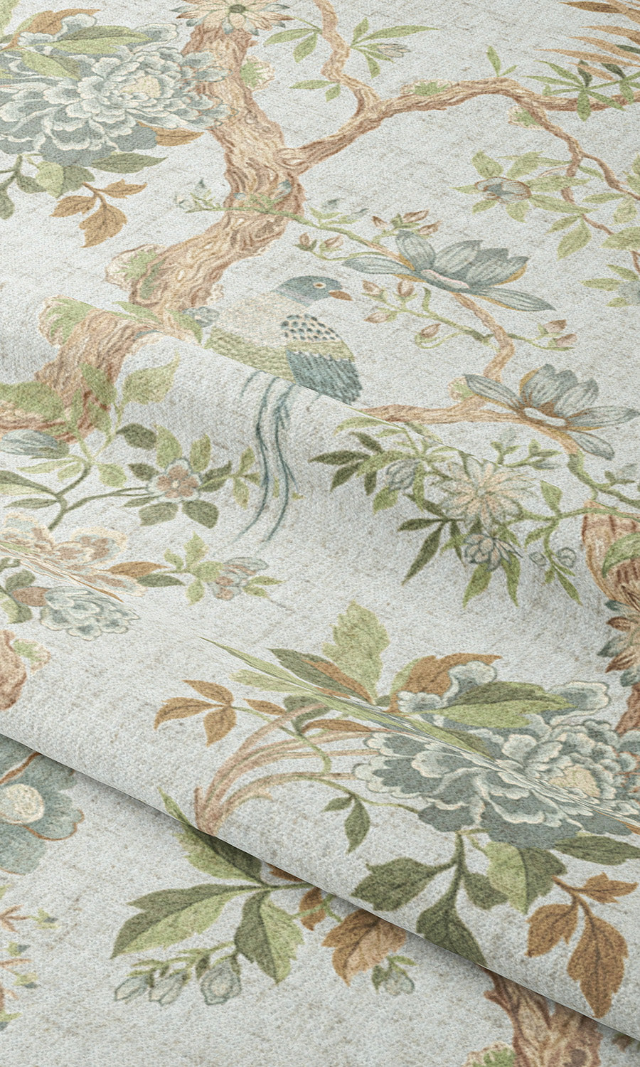 • Stone blues, peachy browns, and olive greens evoke the quiet poetry of a blooming garden on a whimsical duck egg blue canvas