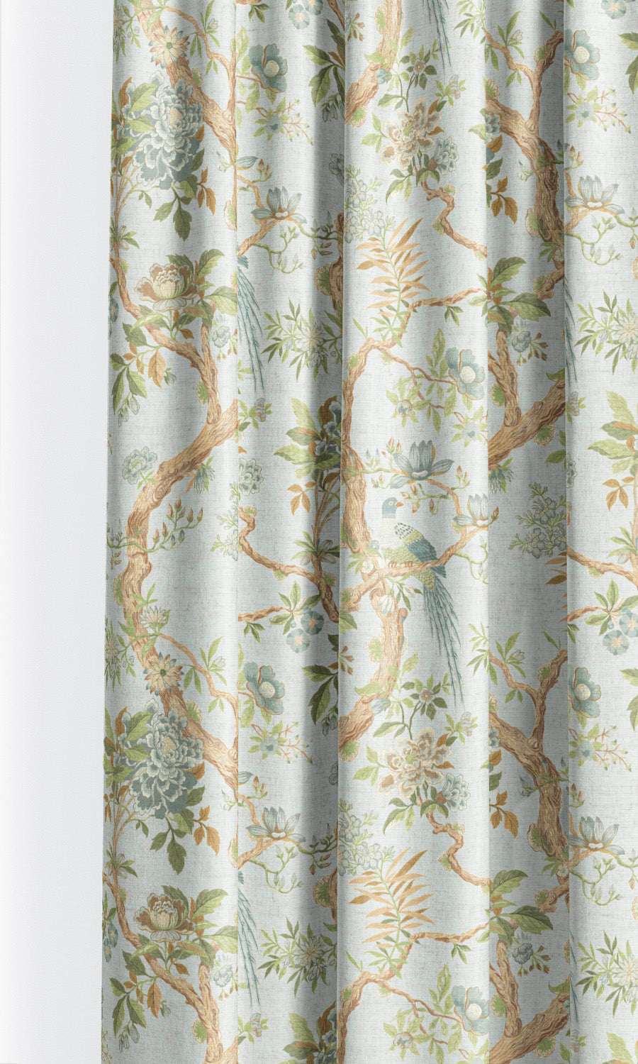 • Stone blues, peachy browns, and olive greens evoke the quiet poetry of a blooming garden on a whimsical duck egg blue canvas