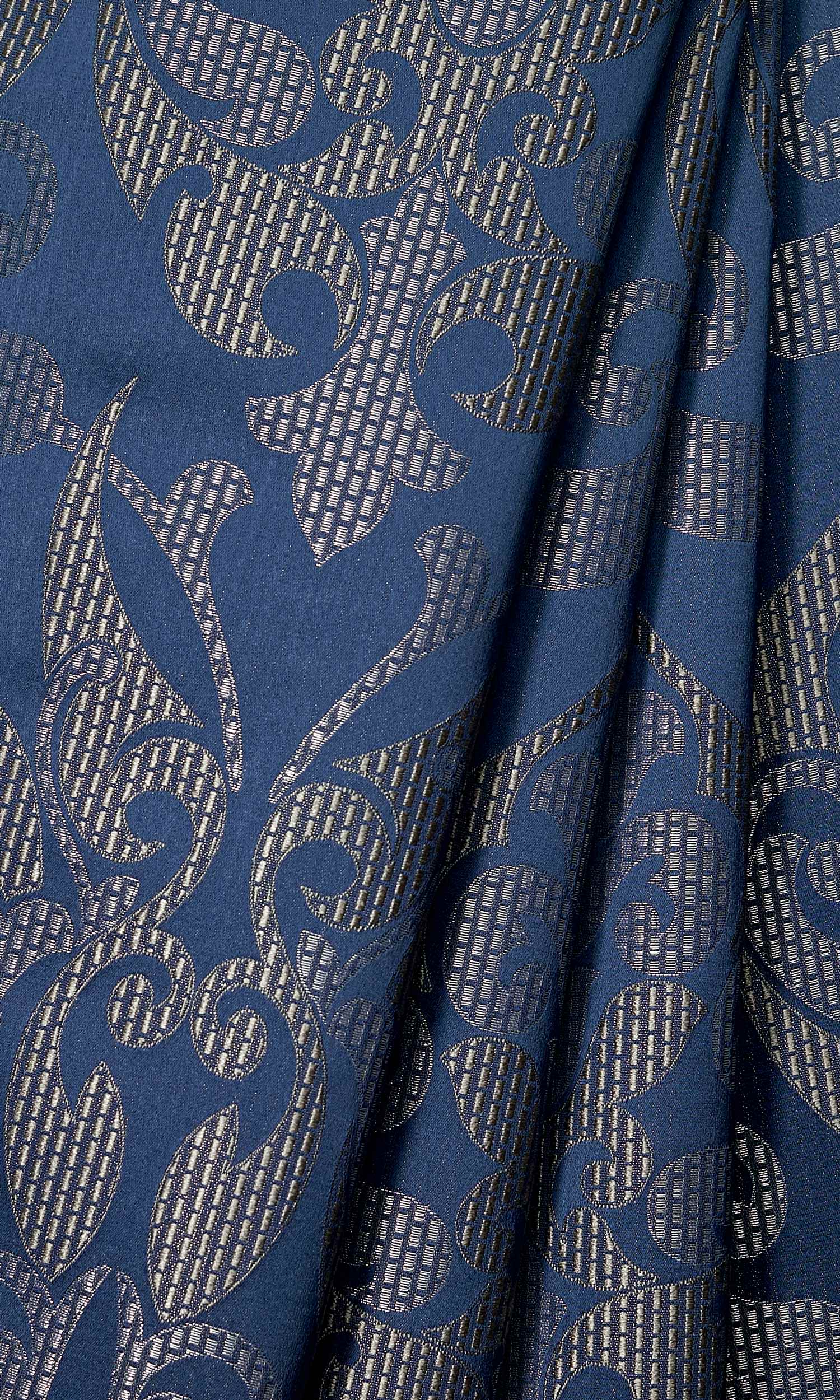 This majestic fabric combines exotic oriental motifs with cool European colors of navy blue and silvery gray. The self patterned emboss look with bamboo stripe weaving details in silvery gray on a deep toned backdrop looks simply stunning.