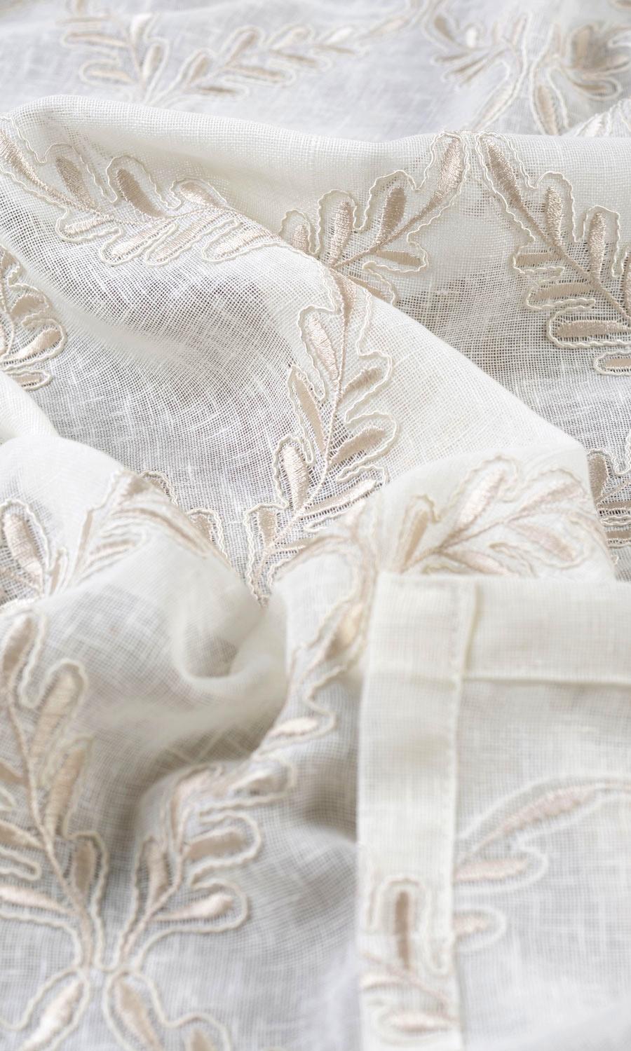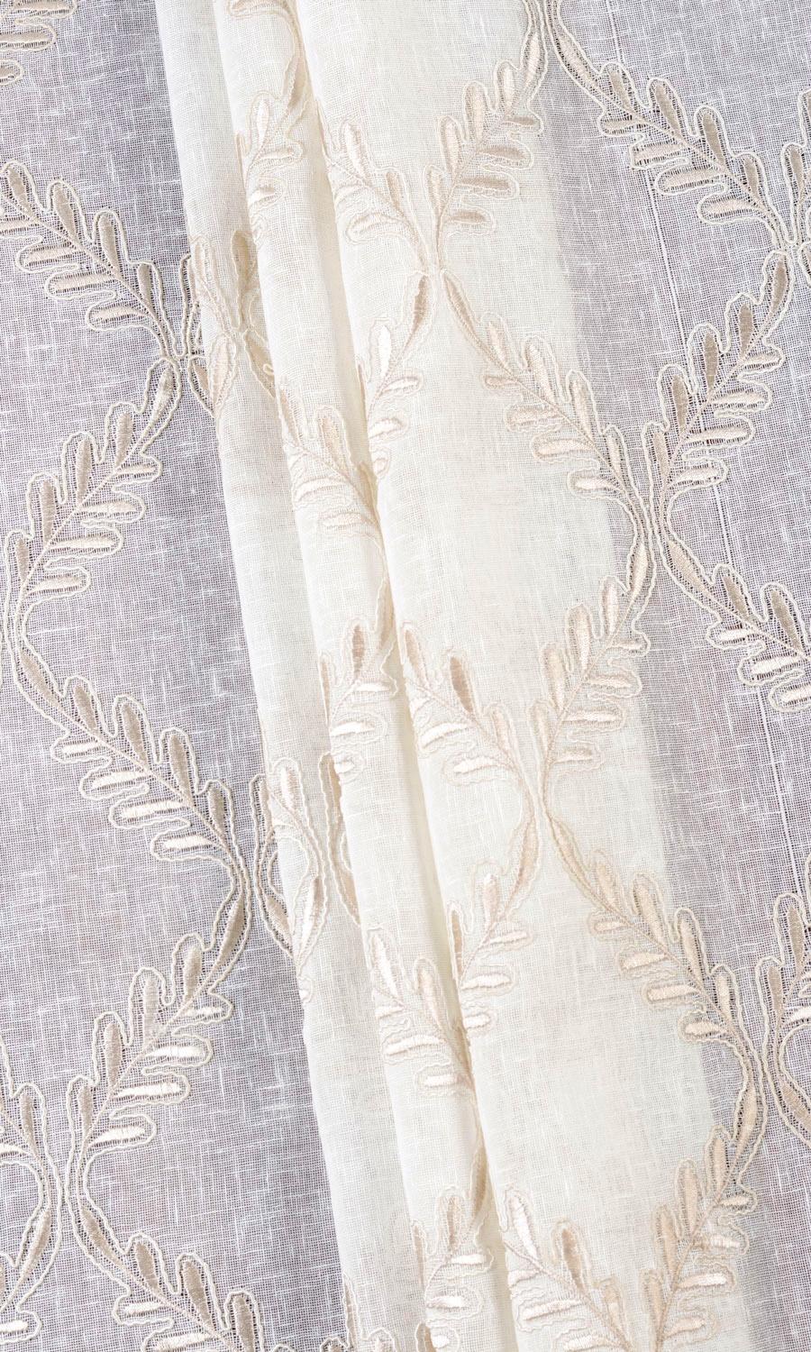 White sheers with a happy twist! 'Botanical' meets 'geometrical' in the embroidered rowan leaf motifs arranged to form a string of diamonds in this lovely fabric. The light beige-white combination helps to further a neutral color theme as well as to offset the vibrance of a color-filled scheme. Versatility at its best!