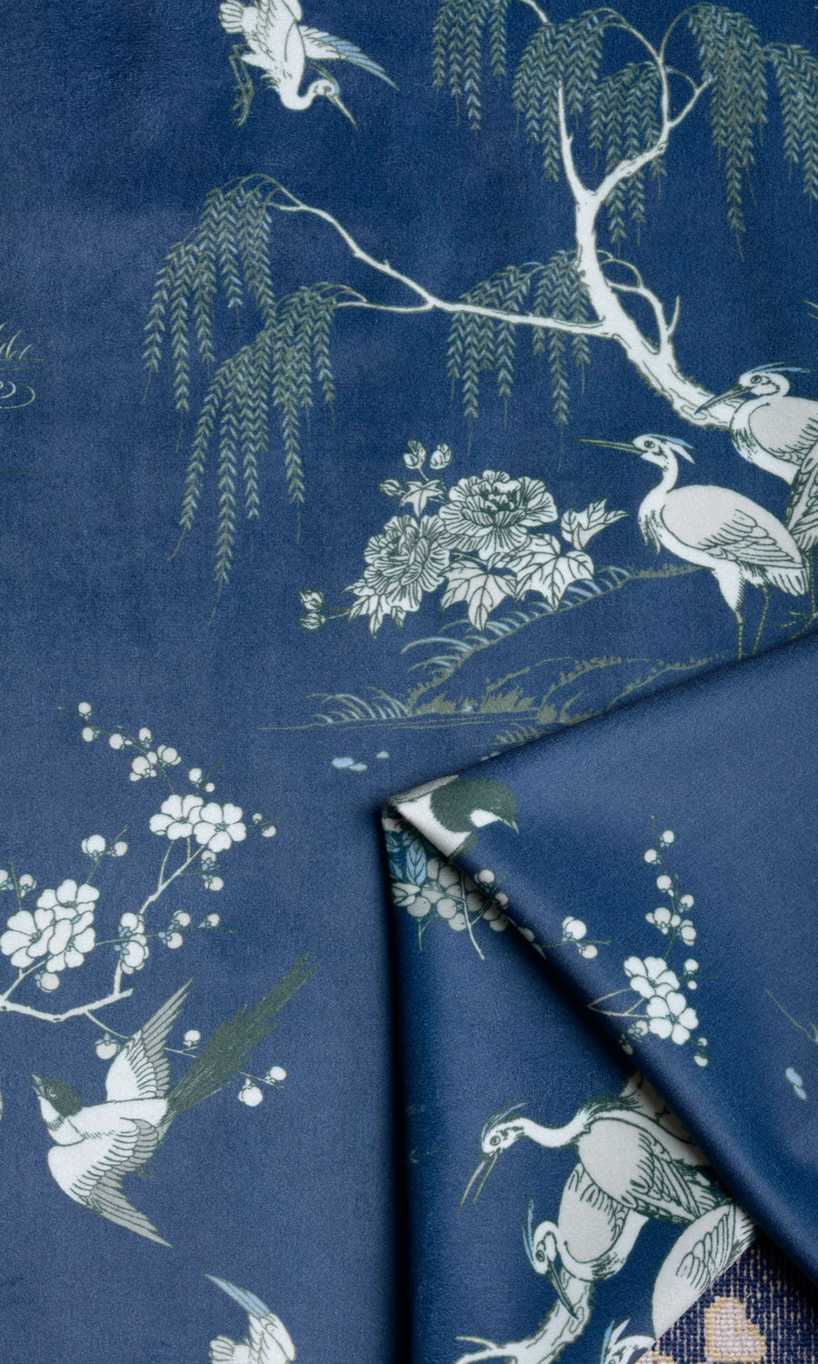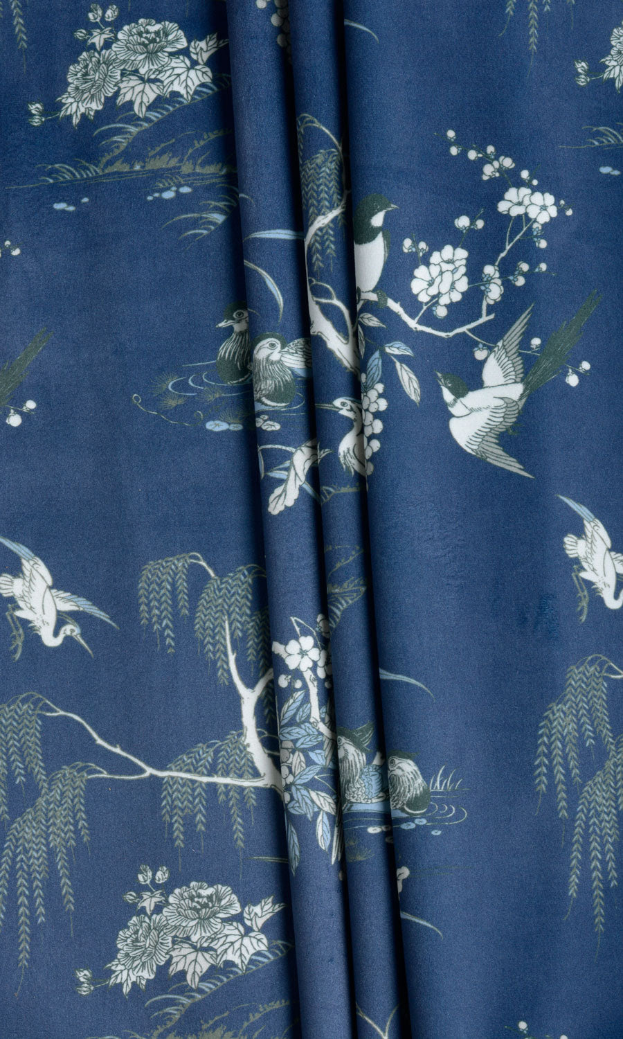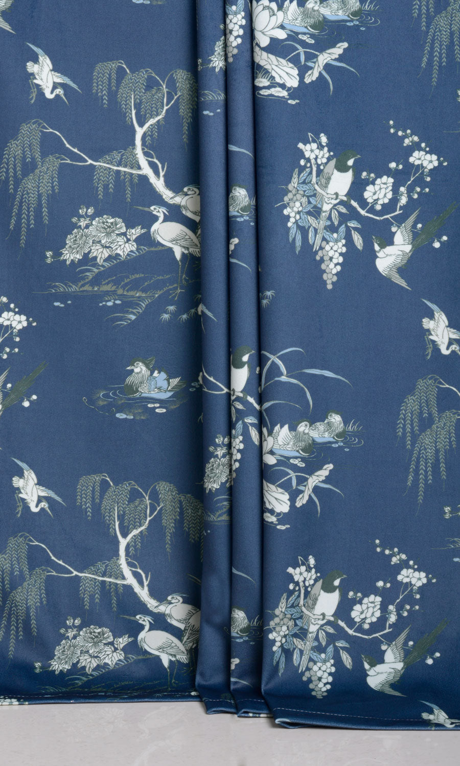 If you love flaunting your love for nature in your home decor, here’s a drapery fabric that can answer the call. Inspired by the classic toile and chinoiserie motifs, this gorgeous velvet print features illustrative sketches of cranes, larks, and swans. Feel drawn to nature’s laps instantly. Curtains and roman shades in this navy blue velvet tinged with white, green, and powder blue accents offer a delightful contrast to light-colored walls.