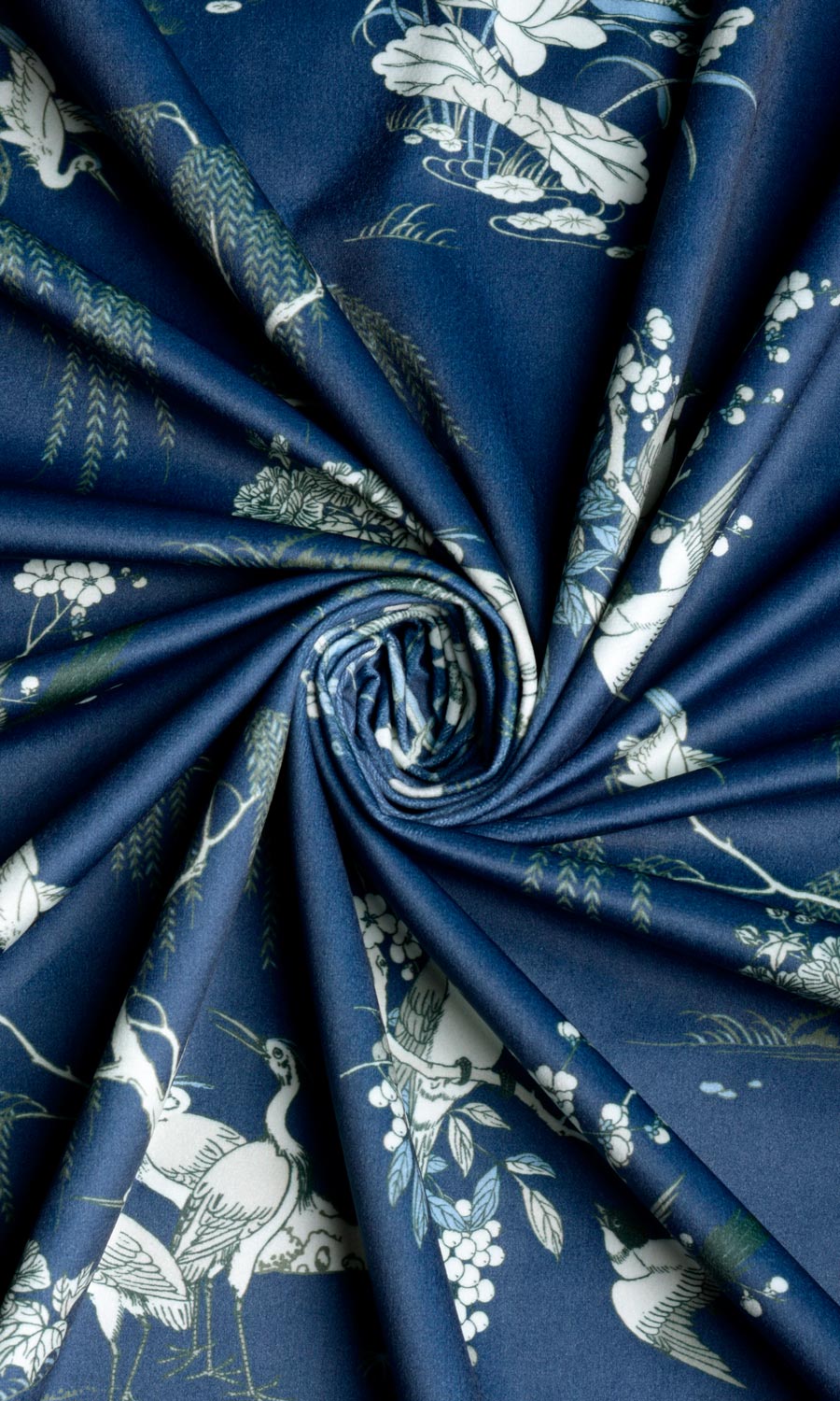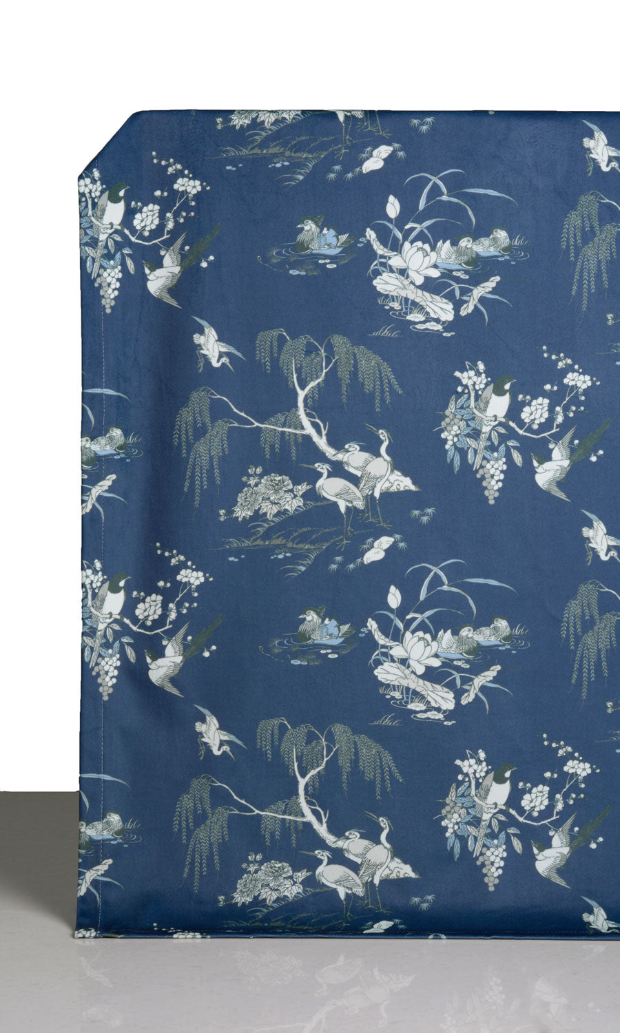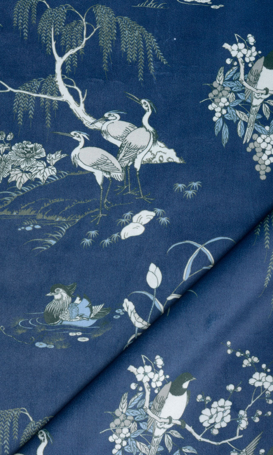 If you love flaunting your love for nature in your home decor, here’s a drapery fabric that can answer the call. Inspired by the classic toile and chinoiserie motifs, this gorgeous velvet print features illustrative sketches of cranes, larks, and swans. Feel drawn to nature’s laps instantly. Curtains and roman shades in this navy blue velvet tinged with white, green, and powder blue accents offer a delightful contrast to light-colored walls.