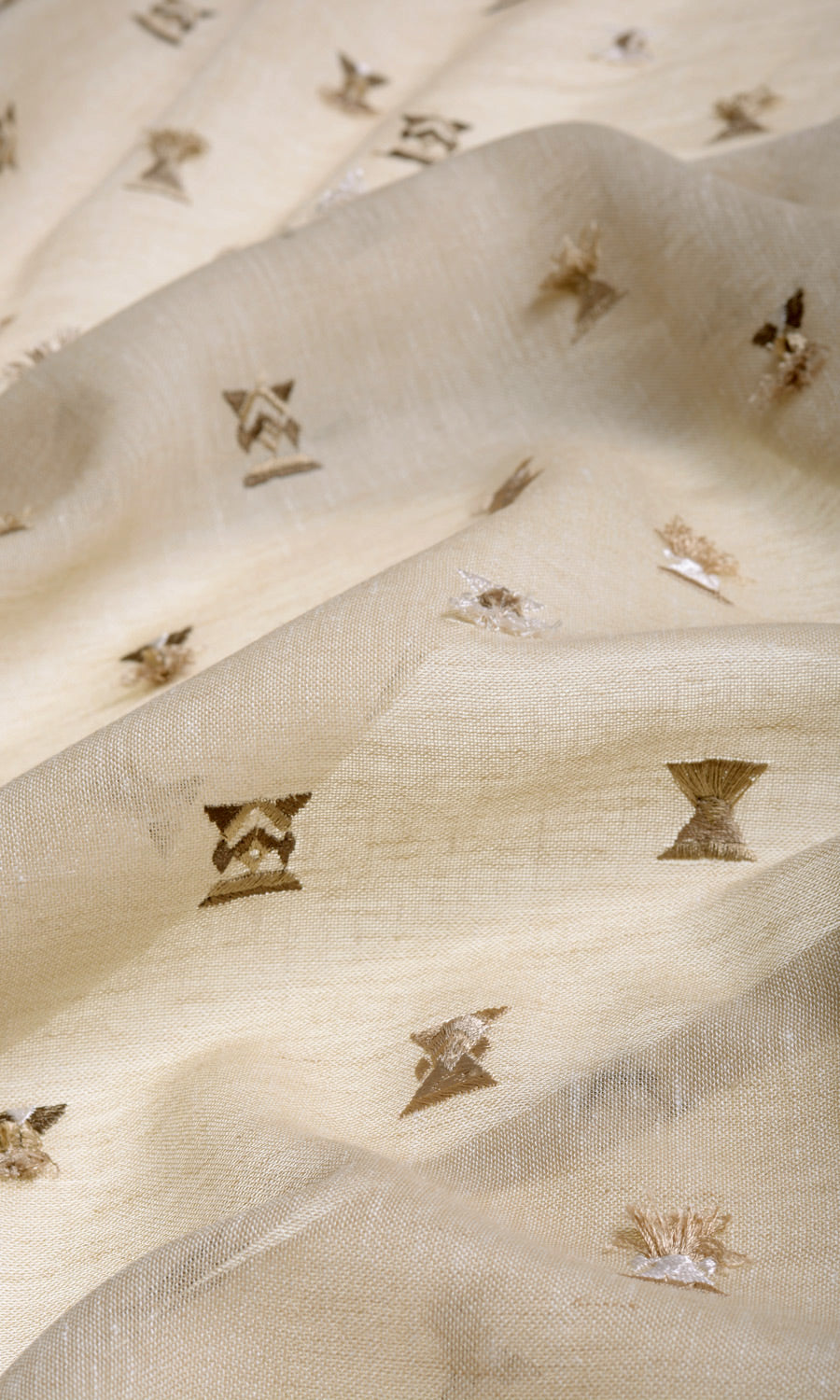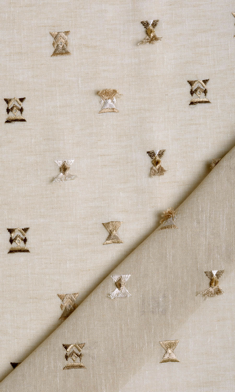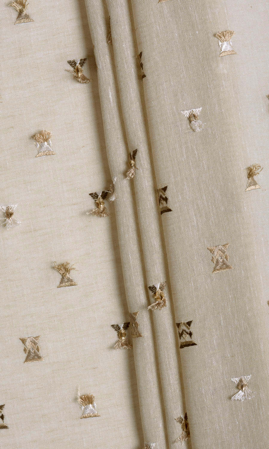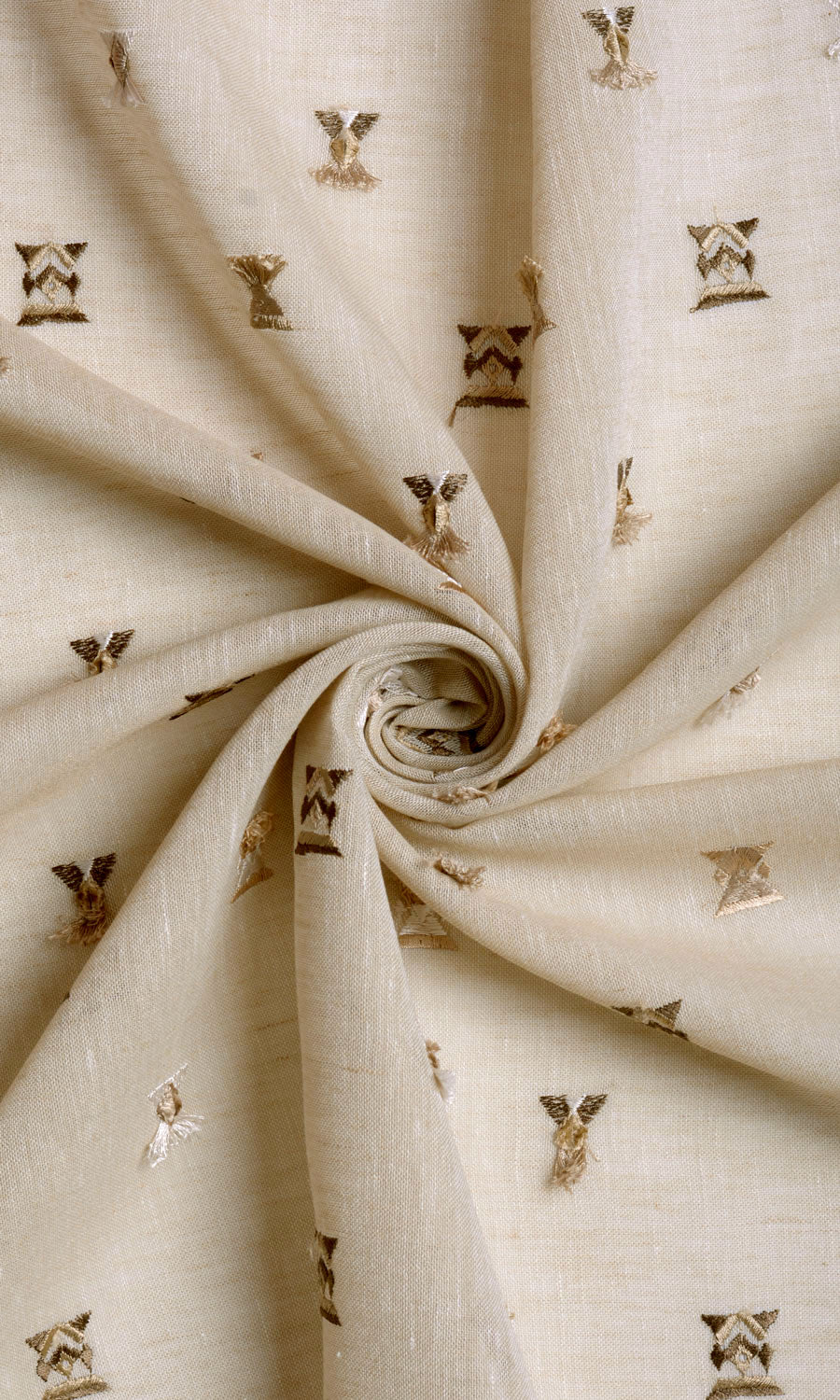 A sophisticated drapery fabric for those who prefer the natural look. Semi-sheer with a hint of translucence, this pale beige base fabric has been embroidered with tip-to-tip twin triangle motifs in monochromatic colors of cedar brown and biscuit beige with off white highlights. Here and there some motifs have been given tasseled effect for a hint of quirkiness.