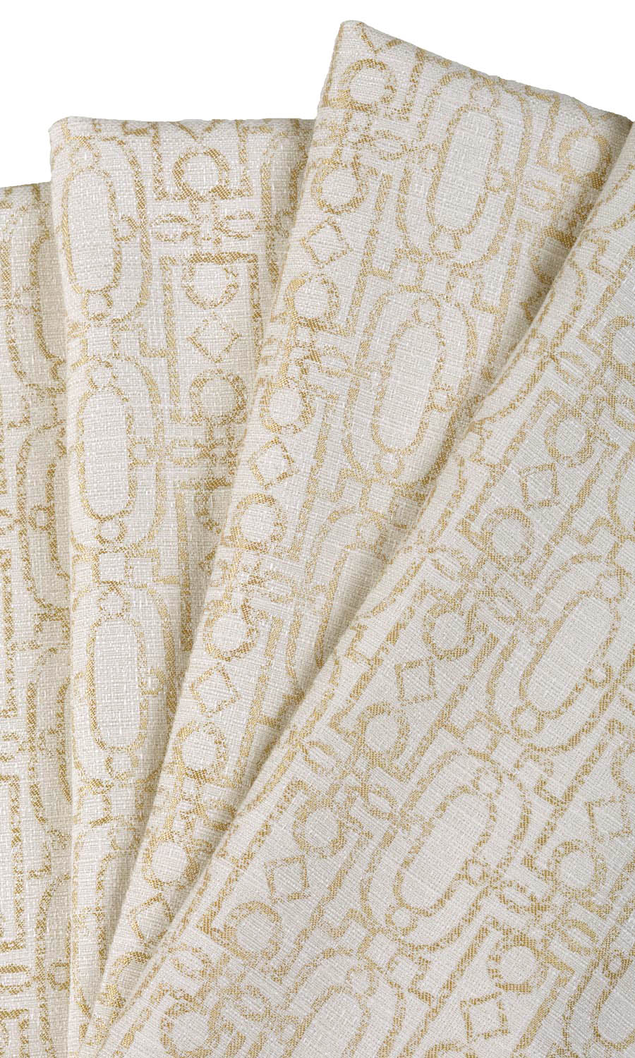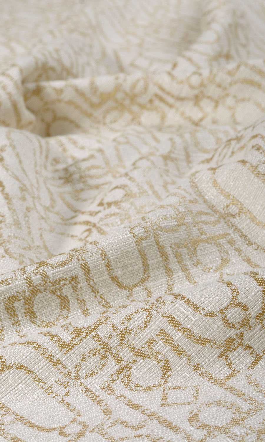 Like monochrome look with off-beat patterns? Check out Dollop. Its color combination is a very gentle pale beige on off white. The all-over pattern is a delicate geometric one with rectangles, ovals, diamonds and circles creating a tribal art look. The polyester cotton blend is sturdy as well as smooth in draping.