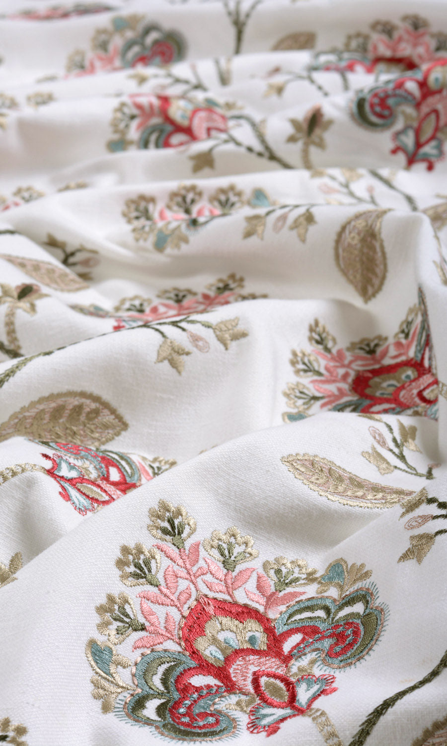 Dragonfruit is unabashed exotica. This white drapery fabric comes embroidered with columns of an undulating floral pattern in coral red, biscuit beige, forest green and punch pink. This rich and finely detailed pattern has ornate fanlike flowers that look straight out of a palace's drapery. Rich and resplendent, Dragonfruit is a flawless choice when your decor is marked with finesse.