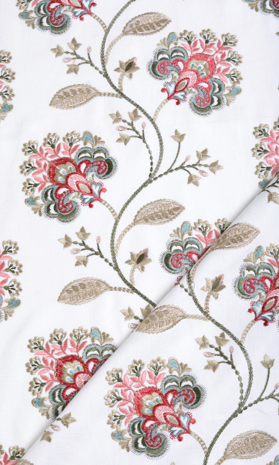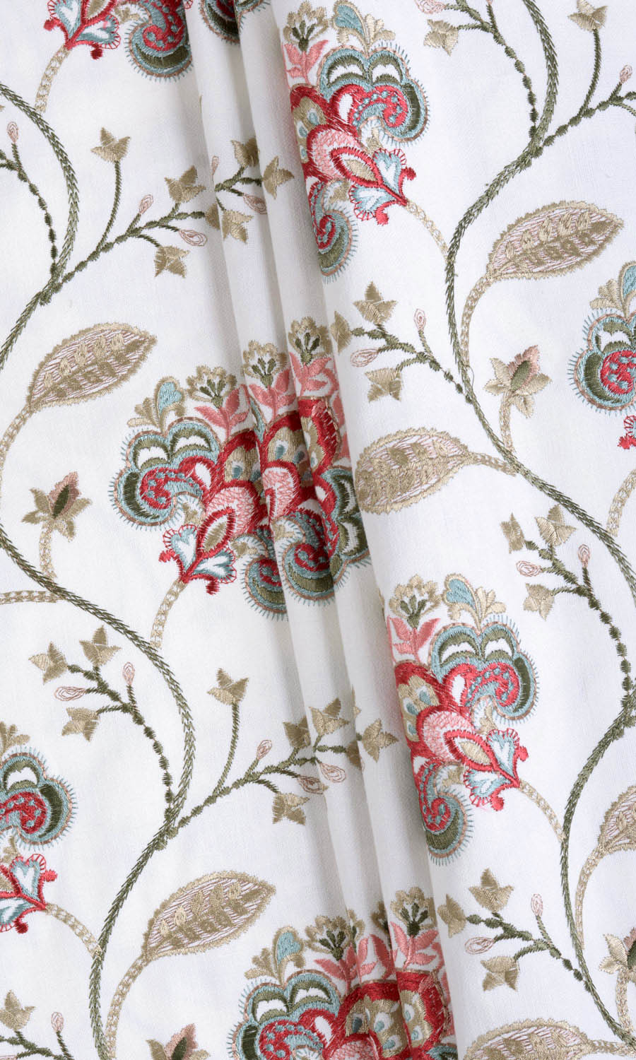 Dragonfruit is unabashed exotica. This white drapery fabric comes embroidered with columns of an undulating floral pattern in coral red, biscuit beige, forest green and punch pink. This rich and finely detailed pattern has ornate fanlike flowers that look straight out of a palace's drapery. Rich and resplendent, Dragonfruit is a flawless choice when your decor is marked with finesse.