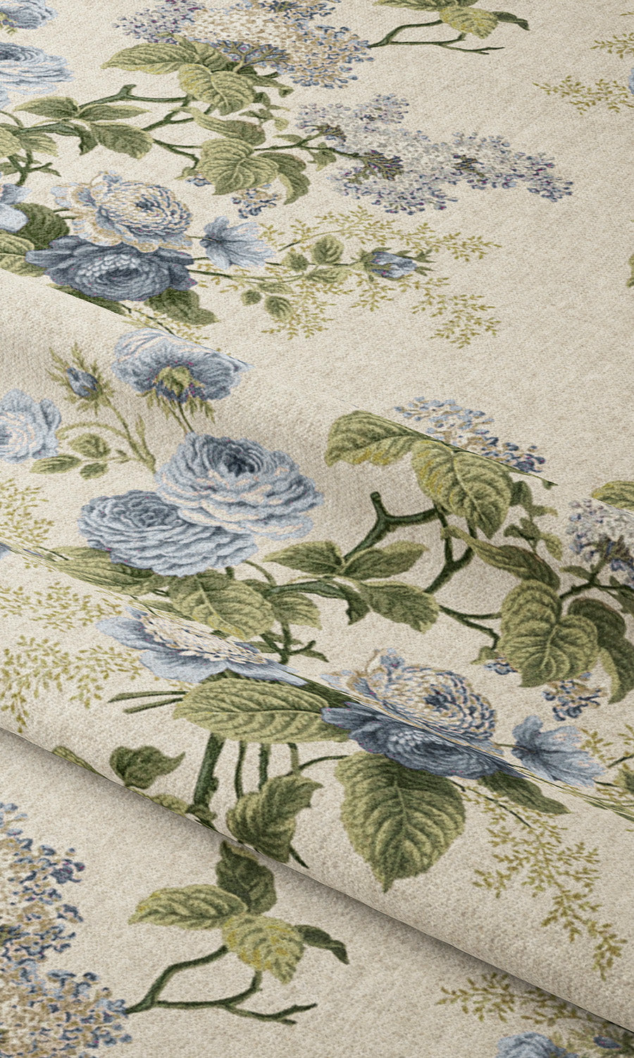 - Its scattered posies of lush larkspurs and rambling roses, unfurling the timeless romance of an English garden in full bloom